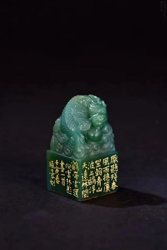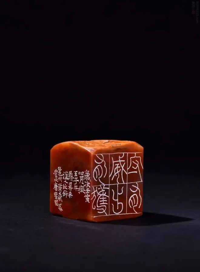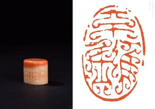 “不雕”作为一种精神追求,潘天寿先生曾在画作中钤盖过此内容印章。所谓“清水出芙蓉,天然去雕饰”,是一种人们追求大朴不雕的境界。印章在取法上,采用鸟虫的风格;在布局上,为了和石头的形式配合,鸟虫的盘曲更加灵活自由,适合随形印的章法排布,但过度的装饰意味又会容易显得工艺。因此,在整体上仍然追求一种概括与简素的审美内涵,兼顾艺术性与装饰性,达到创作者个人的自由表达。