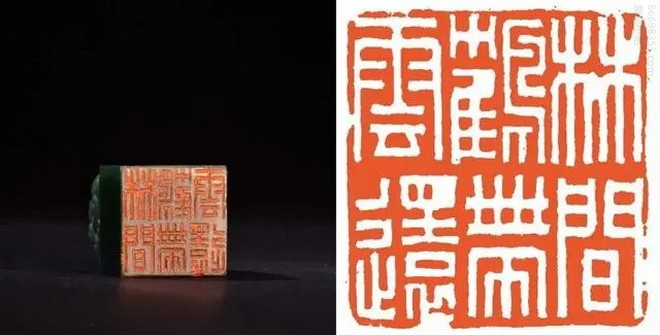 《守有威出有获》:内容出自三国时期张俨《赋犬》诗:“守则有威,出则有获。韩卢宋鹊,名书竹帛。文字造型方面主要借鉴了王子午鼎铭文和战国漆器纹饰。线条上使用了大量的细挺的弧形线条,以强烈的流动线感去营造一种神秘而优美的氛围。刻法上采用了与传统冲切刀方式不同的刻制方式,以类似于错金银的工艺性手法赋予印面华丽精巧的装饰美感。