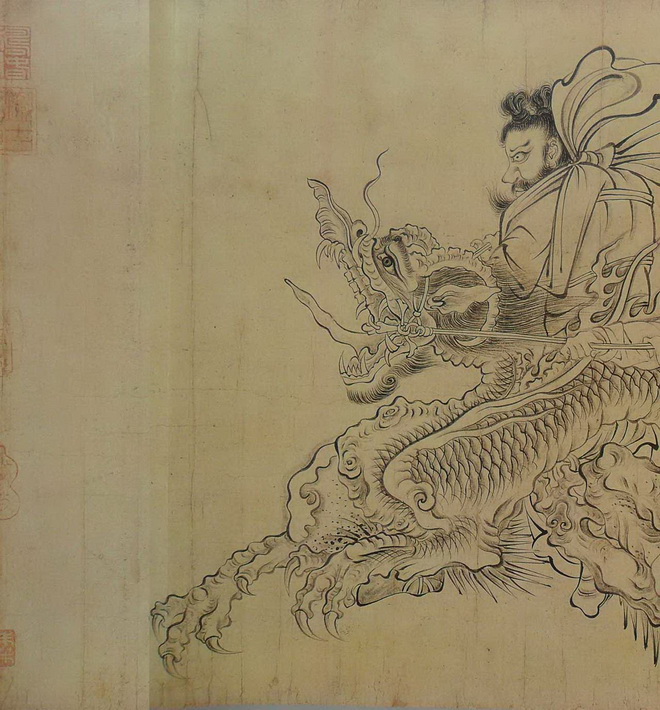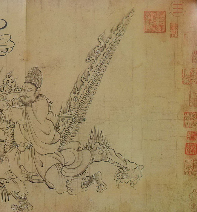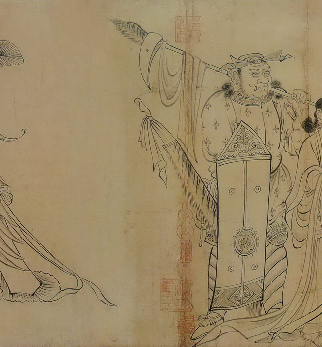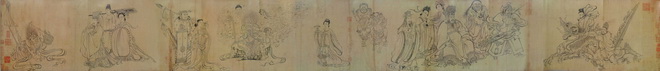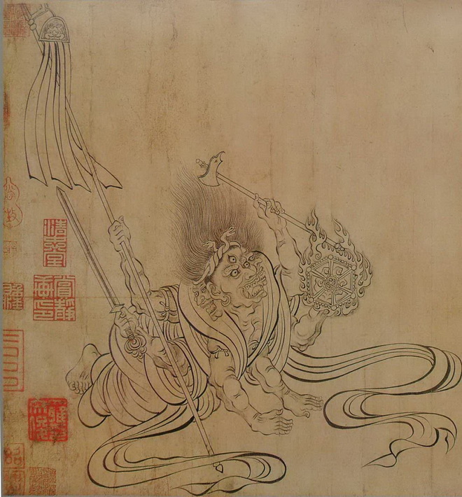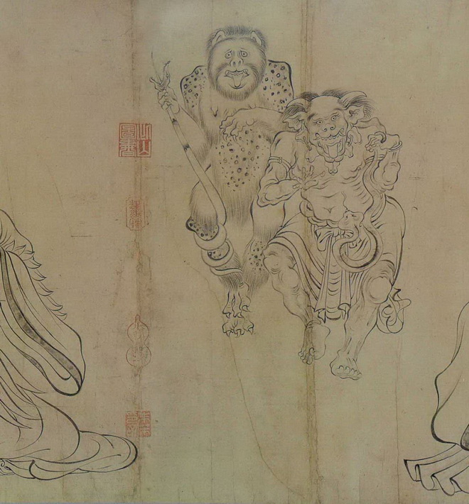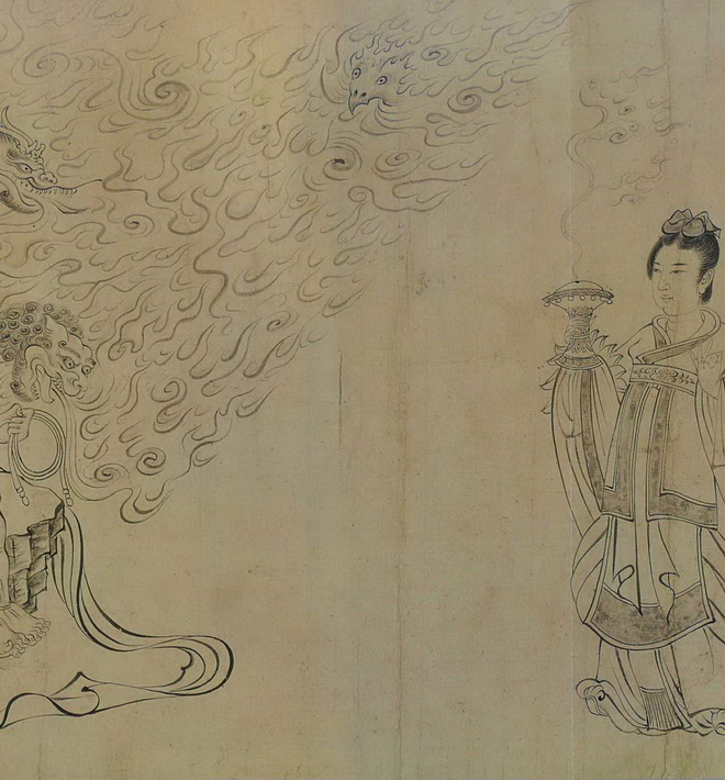 此图写异域故事,而画中的人、鬼神、兽等却完全加以中国化、道教化,当是佛教与中国本土变化至唐日趋融合之势所致。此图意象繁富,以释迦降生为中心,天地诸界情状历历在目,技艺高超,想象奇特,令人神驰目眩。该图着色较淡,近乎白描。