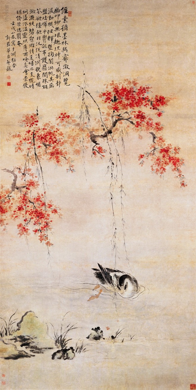 《桃潭浴鸭图》是华嵒61岁时所绘。图中虬曲的桃树枝干上,粉红色的桃花俯仰生姿,宛若锦绣,三两枝初生嫩叶的柳条垂落在清澈见底的潭水之上,随风摆动的柳梢不断触动水面而泛起涟漪,引得潭中野鸭回首注目。
