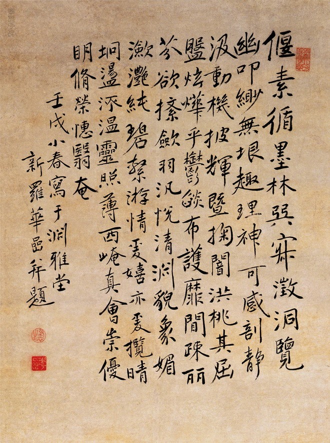 华嵒的花鸟画受明代陈淳、周之冕及清初恽寿平的影响,又集纳众家之长,自成风貌。他在创作中既注重写生,也讲究构图新颖,形象生动,敷色适宜,得明丽松秀之致。时人对他有“机趣天然”,“领异标新,穷神尽变”,“并驾南田(恽寿平),超越流辈”的评论,实非过誉。