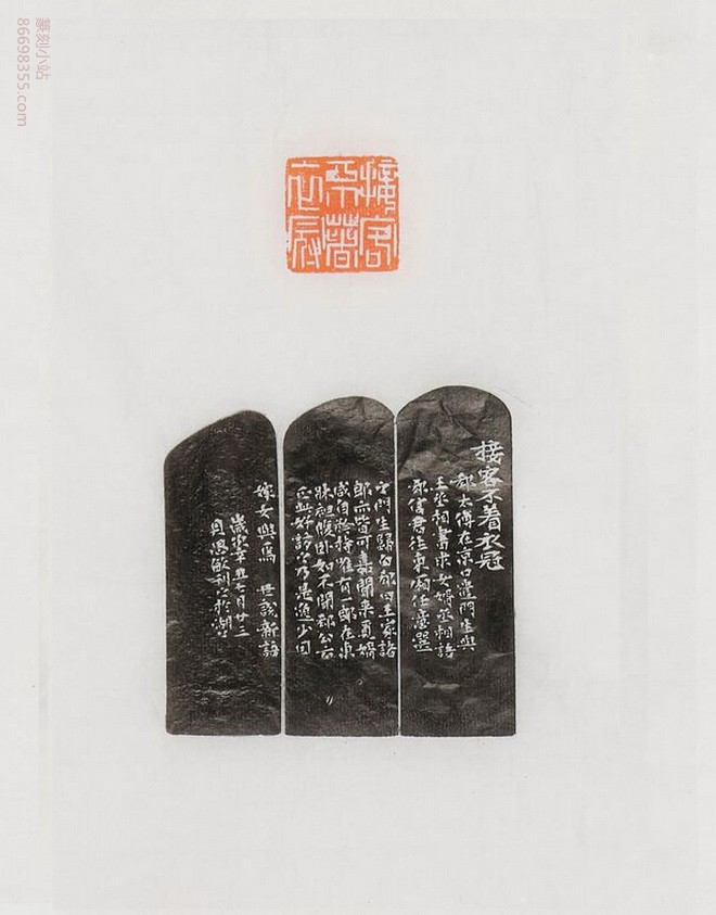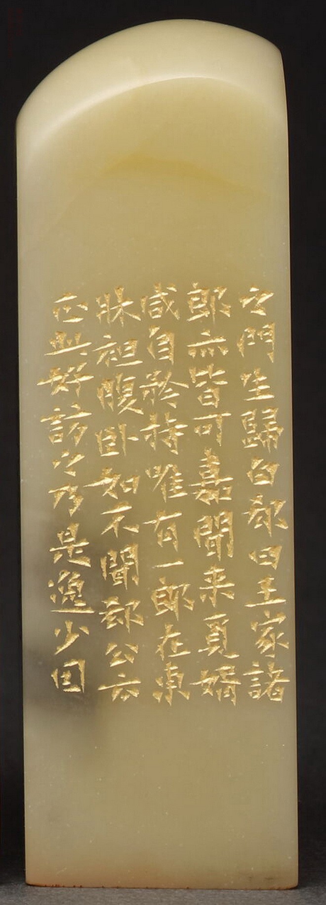 边款:接客不着衣冠。郗太傅在京口,遣门生与王丞相书,求女婿。丞相语郗信:“君往东厢任意选之。”门生归白郗曰:“王家诸郎亦皆可嘉,闻来觅婿,咸自矜持。唯有一郎在东床上坦腹卧,如不闻。”郗公云:“正此好!”访之,乃逸少,因嫁女与焉。世说新语,岁次辛丑七月廿三,贝思敏刊之于湖上。