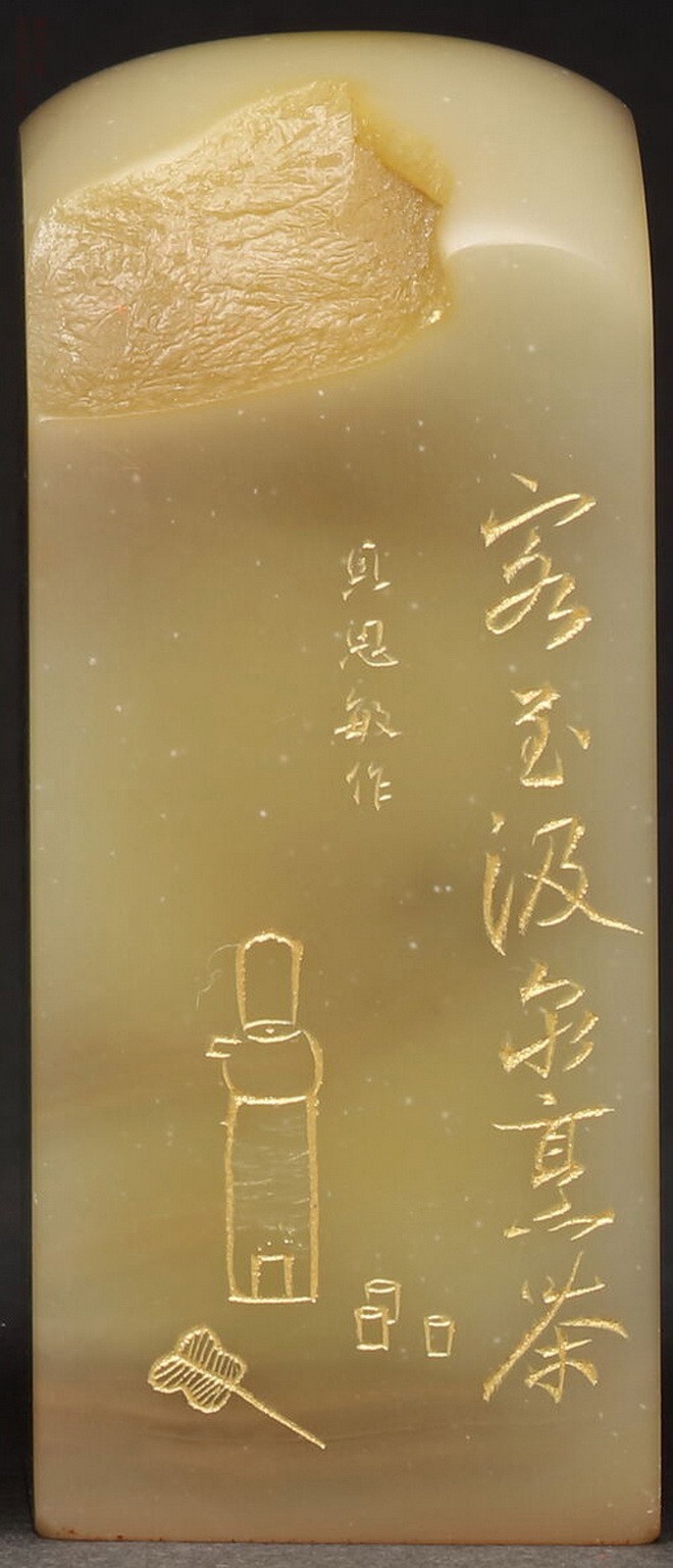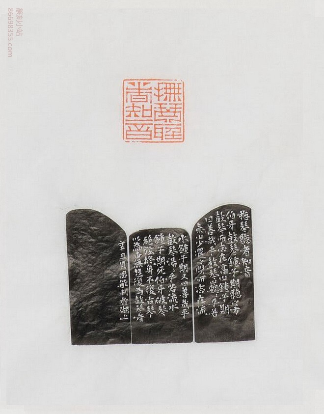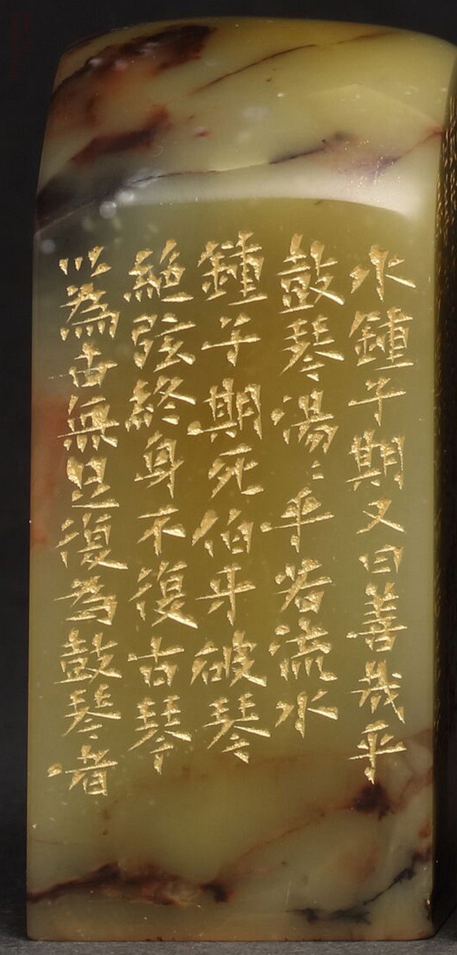 边款:抚琴听者知音。伯牙鼓琴,锺子期听之。方鼓琴而志在太山,锺子期曰:“善哉乎鼓琴,巍巍乎若太山。”少选之间而志在流水,锺子期又曰:“善哉乎鼓琴,汤汤乎若流水。”锺子期死,伯牙破琴绝弦,终身不复鼓琴,以为世无足复为鼓琴者。辛丑贝思敏刊于湖上。
