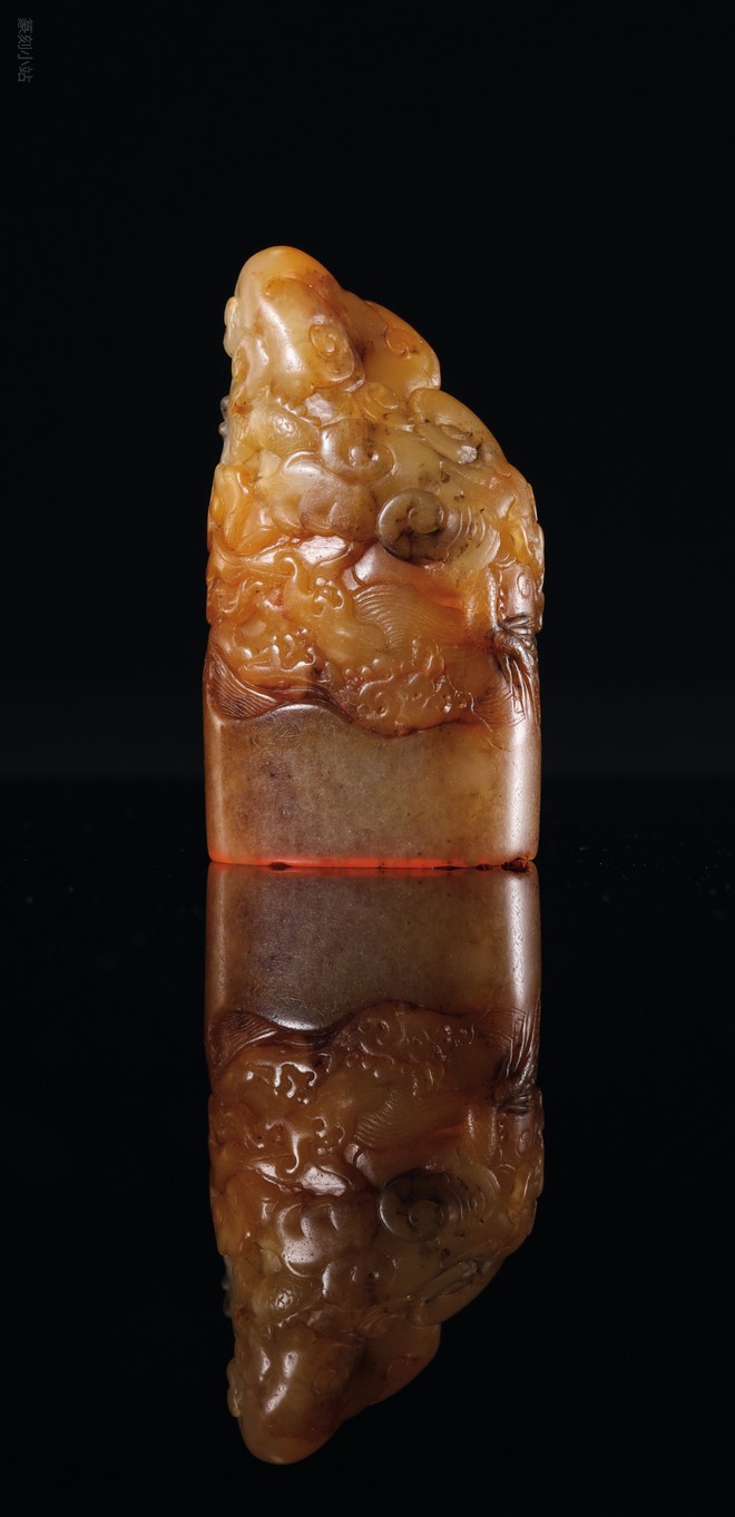 Lot 5655 清乾隆 田黄“意在笔先”云龙钮印;尺寸:3.4×2.1,H:6cm,重:59g;成交价:RMB 724.5万;拍卖会:北京保利拍卖2022年春季艺术品拍卖会;备注:刘国钧(1887-1978)旧藏;
