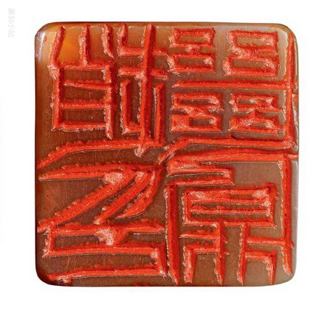 民国山东省议会议员赵继鼐曾请齐白石刻过一对自用印,所用石材为红黄白三色寿山石,色泽亮丽而高雅,其印钮为螭龙嬉戏,四条螭龙相互穿插,神态各异,构图繁复而精巧。