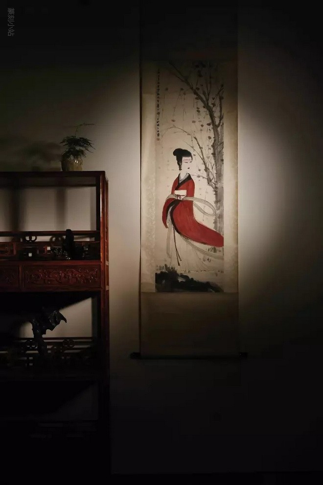 此幅《红衣仕女》所绘即是湘夫人,图中人物形象古朴典雅、端庄凝重,面相丰满美丽,表情沈毅而略带忧伤,特别是眼神的描绘,用淡墨轻描,再以很少的浓墨稍加勾勒,给人以明亮晶莹,妩媚而又深邃的感觉。再加衣带飘扬,动作悠闲从容,那种亭亭玉立,仪态万方的气度,楚楚动人。