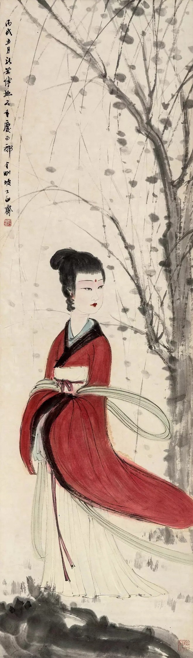 傅抱石(1904-1965)红衣仕女图;纸本设色 立轴 丙戌(1946年)作;拍品尺寸:130×45cm,约5.3平尺;