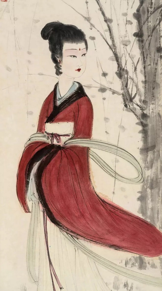 画面中人物线描流畅劲健,树木及枝干点厾洒脱淋漓。画中仕女以红设色,明艳透亮。最为传神的是双眼,淡墨轻勾,透明清空、含情无限。这种神奇的意境,令画面婉约生动,意味深长,使观者流连忘返,难以忘怀。