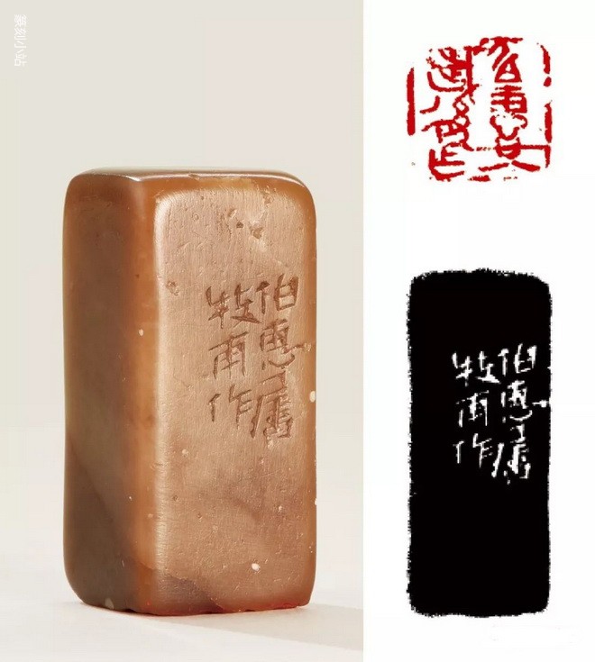 朱文印《刘聘孙印》边款云:“岁己卯(1879)客江西,始知有刘聘孙者。其后五年来粤东始与相见。又六年再来,再相见重,以故知日渐密。领其言论,读其述作,然后知其蓄积,富好慕正,陵当就而考德稽疑,逐订交焉。鲁语云:积土累篑,可成邱山。聘孙原据邱山之势者,知进而不止于乎!其可量哉?聘孙与陵非宴游一朝之好也。因其行止是乎言。庚寅(1890年)夏六月黟黄士陵。”从行文措词看,黄牧甫对学生刘聘孙的品行大为赞赏,刻长款以表彰。两人交谊极厚,光绪十四年(1888)曾同客广州知府孙楫幕中半年,后刘氏失业,牧甫致信黄秉恩为其谋职,关怀备至:“刘聘荪来信属请安。云孙驾翁(孙楫)以京尹缺苦,乃为转荐上海道聂公,聂公无留客意,送盘费而已。于上海又晤吴孟翁(吴翊寅)与庄思缄(庄蕴宽)兄,知肇庆张太尊旧书记辞馆后,思缄曾为之代,及思缄秋试,张公再属觅人,此席至今尚虚,特求先生一言,来信呈阅。此次看卷,韵翁已不往,可否以聘荪先充此,再荐辞书,启事先后,惟先生命。聘荪携家十余口,流寓于此,是不可一日闲者,先生栽植寒微,知必以急者为先,感同身受。敬请升安!十月月二十八日,晚生黄士陵谨上。”此《刘聘孙印》作于1890年,黄牧甫的创作进入创新期,以独具特色的方朱文出之,是高度融合的篆书与古典印章形式的紧密结合。