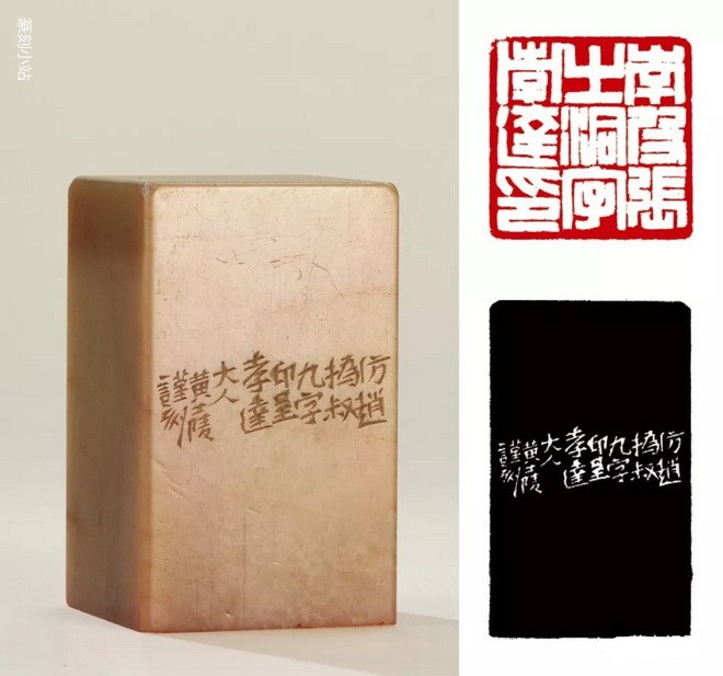 边款:仿赵撝叔九字印,呈孝达大人,黄士陵谨刻。