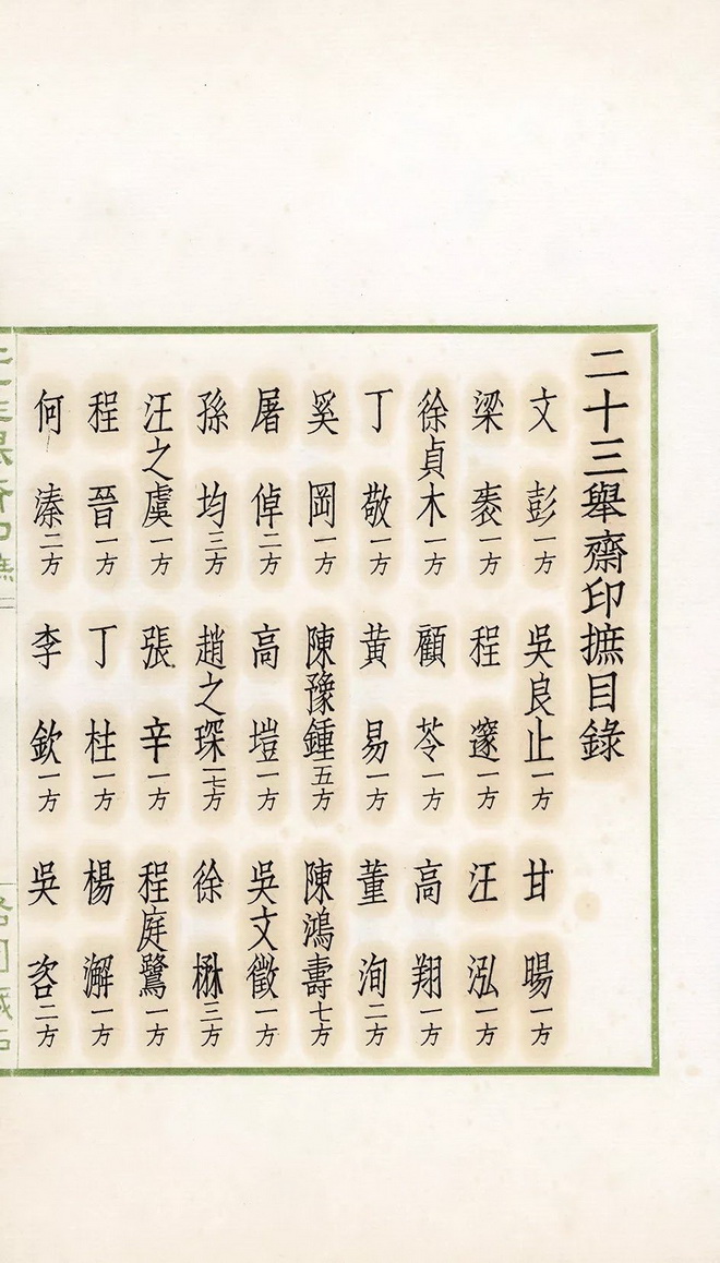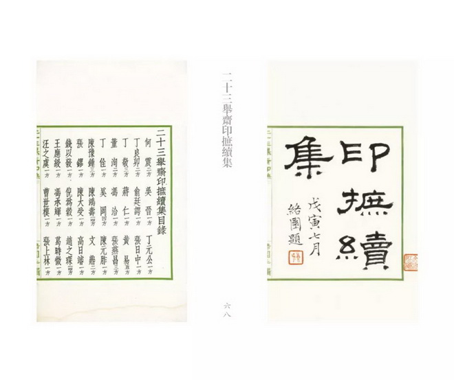 《二十三举斋印摭》是一部集大成的明清篆刻流派印谱,分为《二十三举斋印摭》《二十三举斋印摭续集》和《次闲篆刻高氏印存》三卷,共六册。收录的篆刻家作品上起明代中期,下至清代晚期,前后三百余年,共八十七位印人,其中不仅有文人印开创者文彭、何震,浙派“西泠八家”丁敬、蒋仁、黄易、奚冈、陈豫锺、陈鸿寿、赵之琛、钱松,皖派大家吴让之,更有“为六百年摹印家开一门户”的赵之谦,兼有胡震、徐三庚、文鼎、锺以敬、释达受等当时活跃于印坛的诸多印人。