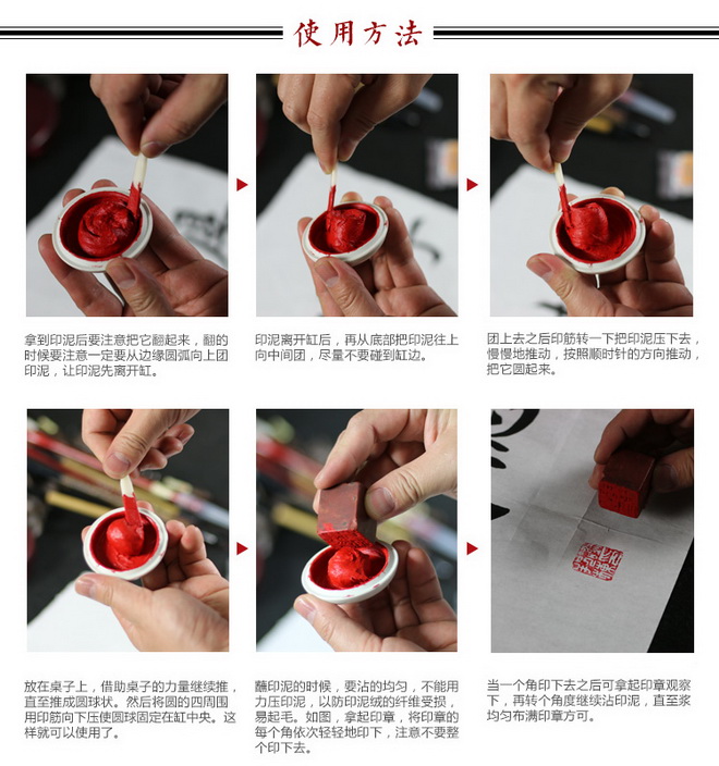 初初次印泥入缸:将印泥盛装于细瓷、玛瑙、玉等不吸油的带盖印泥盒内(亦称印泥缸)。金属的盒子不可用,因为会与朱砂产生缓慢的化合反应,导致颜色改变。