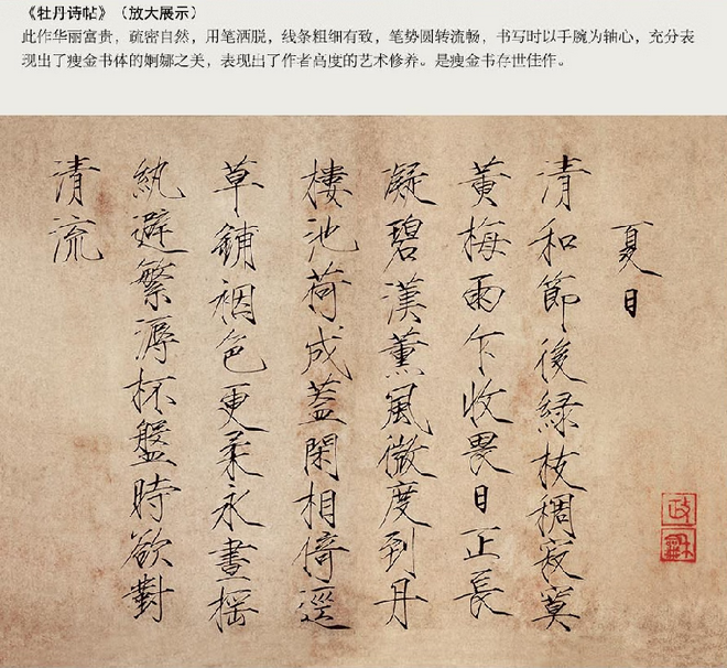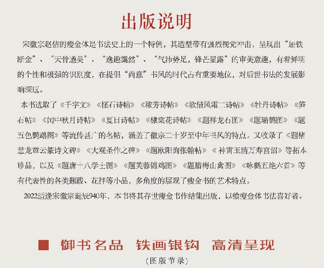 选取了《千字文》《怪石诗帖》《秾芳诗帖》《欲借风霜二诗帖》《牡丹诗帖》《笋石帖》《闰中秋月诗帖》《夏日诗帖》《棣棠花诗帖》《题祥龙石图》《题瑞鹤图》《题五色鹦鹉图》等流传甚广的名帖,涵盖了徽宗二十岁至中年书风的特点。又收录了《题楮慧龙章云篆诗文碑》《大观圣作之碑》《题欧阳询张翰帖》《 神霄玉清万寿宫诏》等拓本珍品,以及《题唐十八学士图》《题芙蓉锦鸡图》《题腊梅山禽图》《咏鹤五绝六首》等有代表性的各类题跋、花押等小品,多角度的展现了瘦金书的艺术特点。