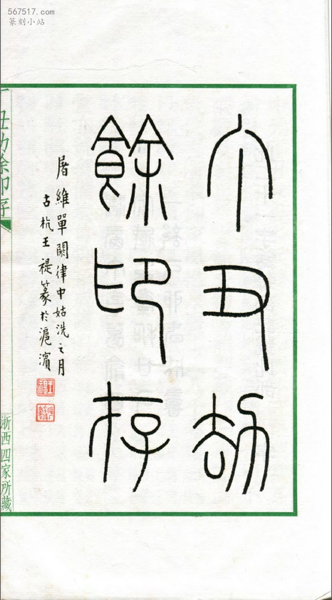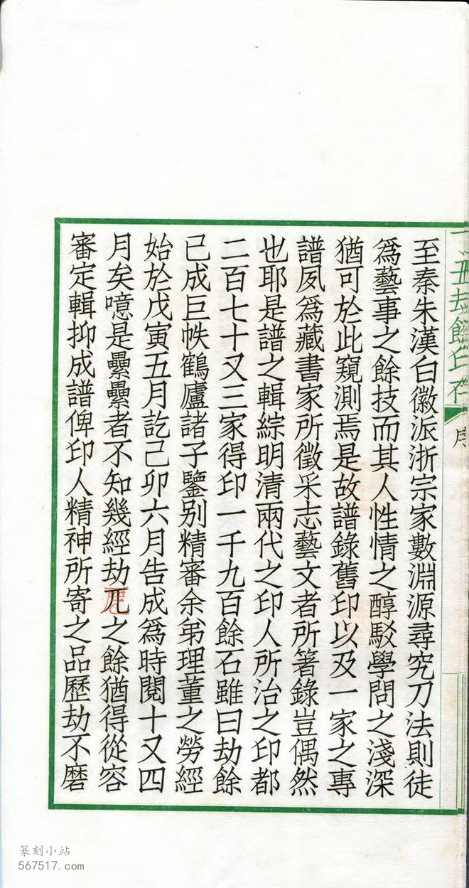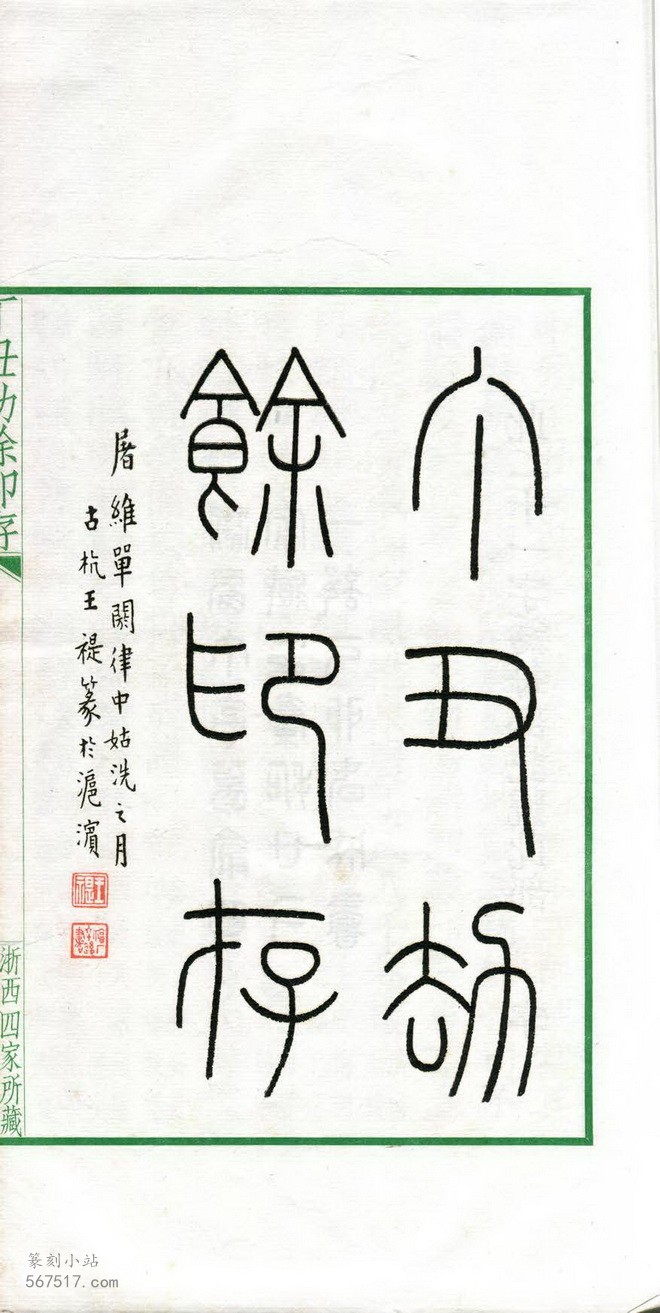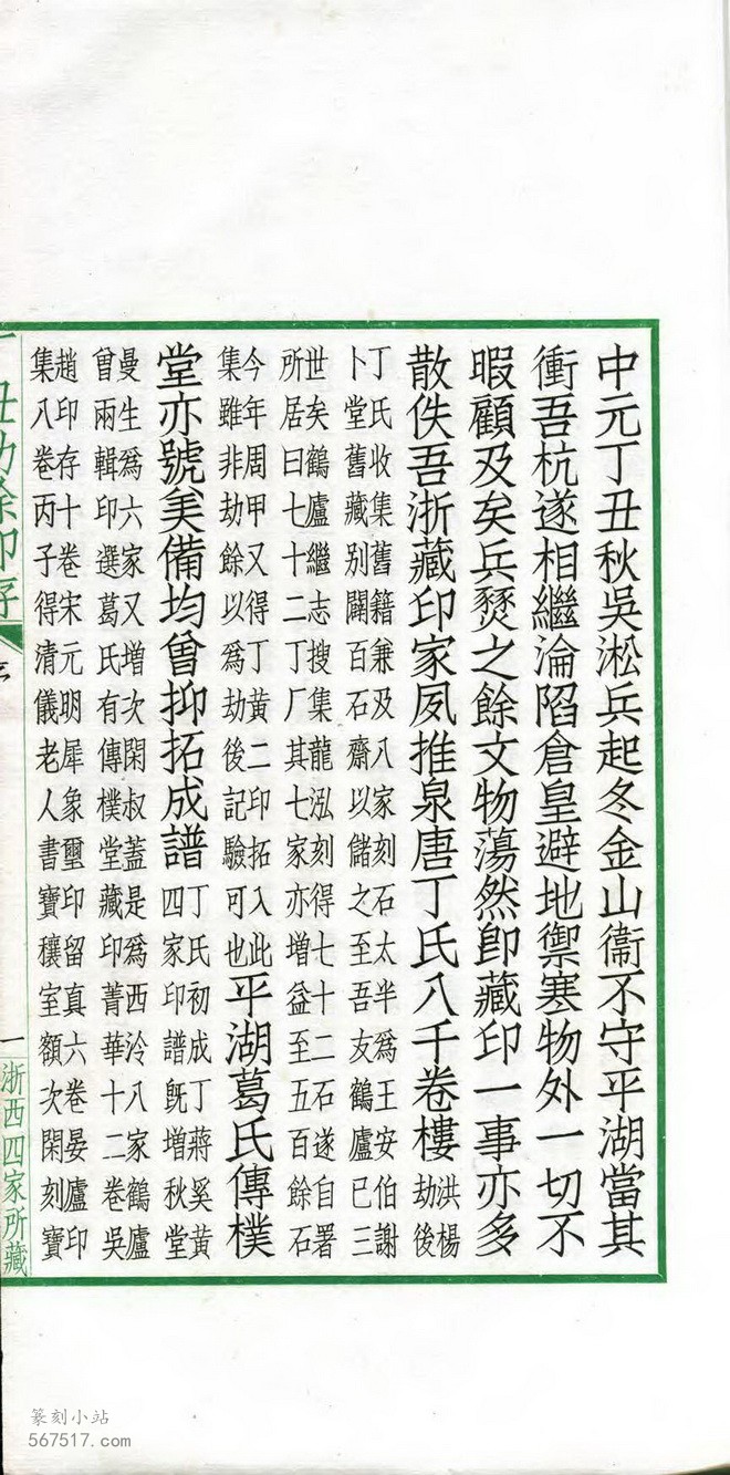 丁丑劫馀印存,二十册,分卷。丁仁(辅之)、高时敷(绎求)、俞人萃(序文)、葛昌楹(书徵)四家劫馀之藏印编辑而成《丁丑劫馀印存》此谱。篆刻小站编辑整理分享。是谱板框粗线绿刷,半框横十三点一,竖十九点三公分,扉叶有王禔署“丁丑劫馀印存,屠维单阏律中姑洗之月,古杭王禔篆于沪滨”篆书题耑,里叶有“浙西丁高葛俞四家藏印,集拓二十一部,己卯春成谱。
