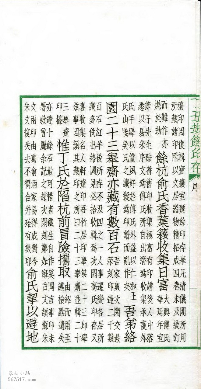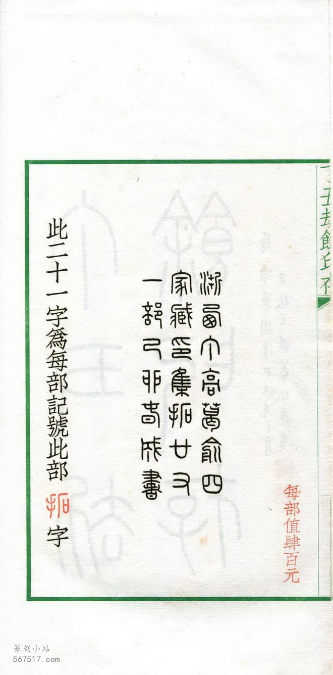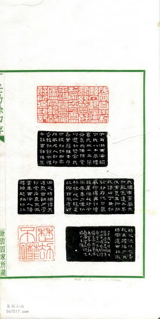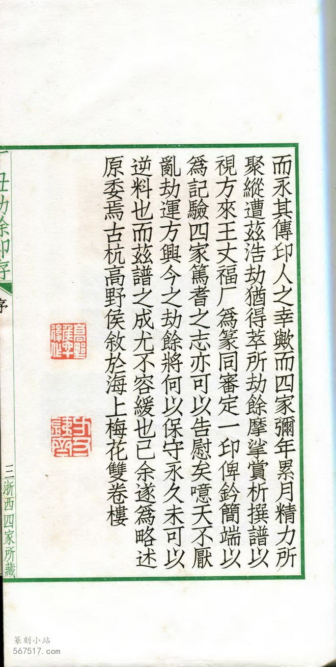 丁丑劫馀印存,二十册,分卷。丁仁(辅之)、高时敷(绎求)、俞人萃(序文)、葛昌楹(书徵)四家劫馀之藏印编辑而成《丁丑劫馀印存》此谱。篆刻小站编辑整理分享。是谱板框粗线绿刷,半框横十三点一,竖十九点三公分,扉叶有王禔署“丁丑劫馀印存,屠维单阏律中姑洗之月,古杭王禔篆于沪滨”篆书题耑,里叶有“浙西丁高葛俞四家藏印,集拓二十一部,己卯春成谱。