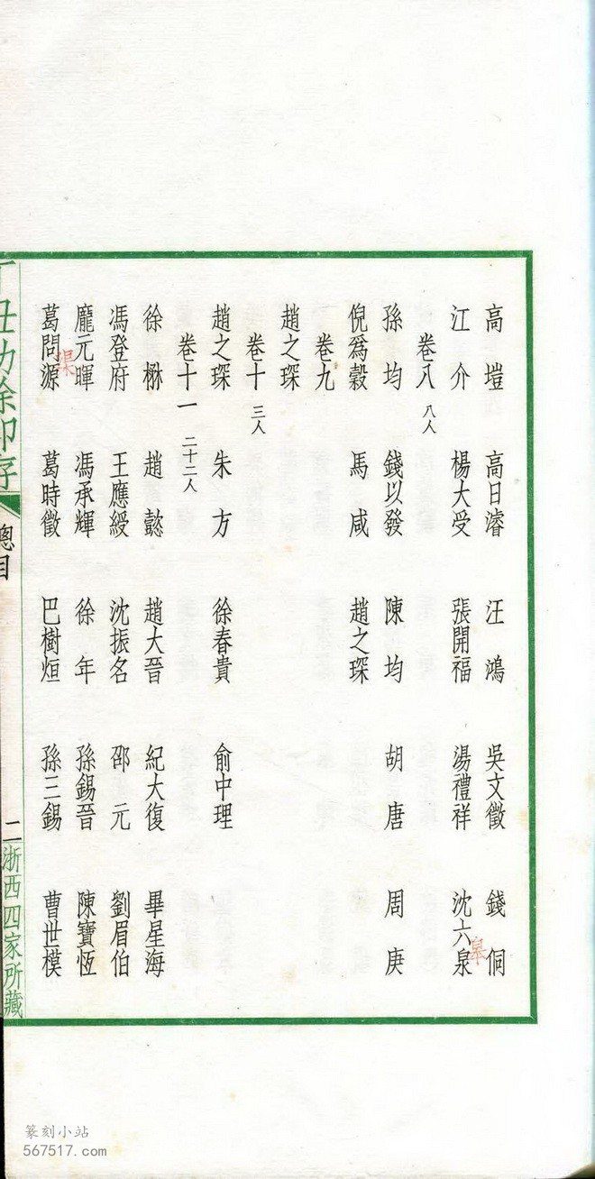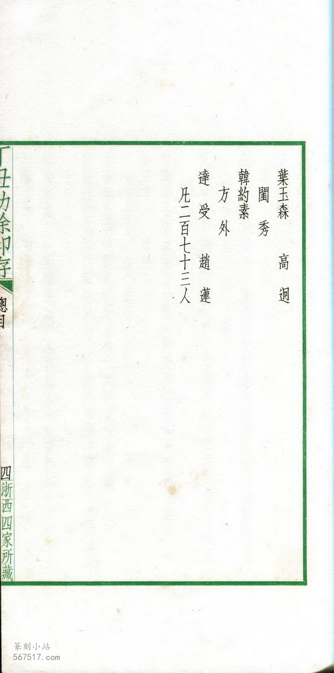 此二十一字为每部记号,此部拓字”书牌叶,继有高野侯序一则,又王福盦“戊寅夏,杭县丁鹤庐、高络园、馀杭俞荔盦、平湖葛晏庐同辑印记”、“历劫不礳”印记两方,总目一则,每首附印人小传一则,卷二十谱末附照片一帧,书口上署“丁丑劫馀印存”仿宋体字样,中署卷数、叶码,下署“浙西四家所藏”仿宋体字样。