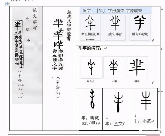 我们比较一下。把丰的一横,一分为二,便是“半”字。去了“丰”一横,全是"牛"。“芈”,中间那竖短些,就是“羊”字。由于,我们归纳,把半、丰、牛、羊、芈列为同一造字思想。“八”是自由活动,在不同的部位产生不同的意思。