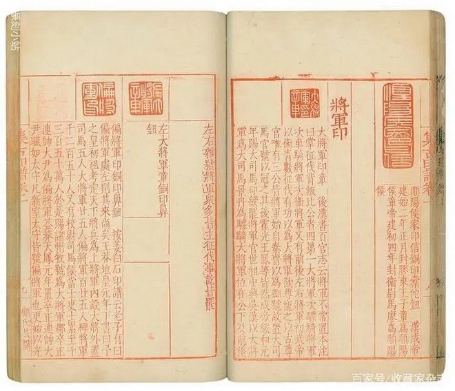 该书按《汉旧仪》所记印制,将古印顺次排列。《汉旧仪》云:“诸侯王,黄金玺,橐佗钮,又曰:玺,谓刻曰‘某王之玺’。”如该印谱中所刻之“荆王之玺”(图2),此为汉刘贾(汉高祖刘邦堂兄)之印;“列侯,黄金印,龟钮,文曰:‘某侯之章’”,如书中所印“巨野侯章”(图3);“丞相太尉与三公前后左右将军,黄金印,龟钮,文曰‘章’”,如“大将军印章”(图4);“中二千石、银印,龟钮,文曰‘章’”,如“中部偏将军章”(图5);“千石、六百石、四百石至二百石以上,皆铜印,鼻钮,文曰‘印’”,如“司徒左常史印”(图6)。关于古印之字体,元代陶宗仪在其所著《南村辍耕录》中记有:“吾衍云:‘汉有摹印篆,其法只是方正篆法,与隶相通。后人不识古印,妄意盘屈,且以为法,大可笑也。’多见故家藏得汉印,字皆方正,近乎隶书,此即摹印篆也。”可见秦汉之时刻印用近隶书的方正篆体字,且“汉晋印章,皆用白文,大不过寸许”,“唐用朱文,古法渐废。至宋南渡,绝无知此者”。根据此法,再对应该书中所列各印,可管窥秦汉古印之一二。