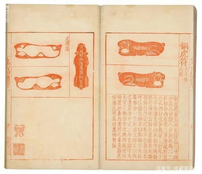 是书以秦汉玺冠为首。王玺君印置于官印之前,官印各从其类,如将军、偏将军、军司马、假司马、军假司马、别部司马之属。每项又按材质依次为:玉、玛瑙、宝石、银、铜、磁(瓷)。官印最后还刻有印钮样式,从螭钮、龟钮至亭钮、鼻钮(图7),完整展现玺印原貌。又将西汉铜虎符单列于后,将其左、右两侧行状、合二为一时俯视面图、阴面相合部分一一绘出(图8),并介绍其由来,内容丰富、详实。卷二至卷六收录各姓氏私印,按照沈韵所定四声,即平(上平、下平)、上、去、入次第排列。按其凡例所提:“集印以诸友所收藏者为主次,及子昂《印史》,杨宗道、吴孟思、王厚之、钱舜举诸家《印谱》,王俅《啸堂集古录》,吾子行《学古编》并得收入至于欣赏,编亦所不遗”,顾氏《集古印谱》不仅拓印搜购之古印,还与前人印谱相对照,查漏补缺。