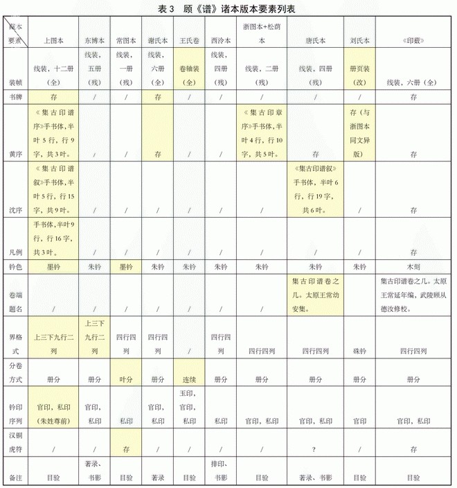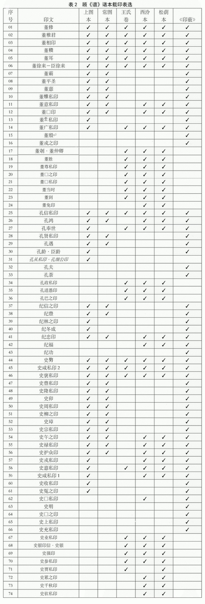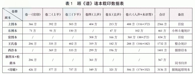 如前所述,目前可以用于研究引用的顾《谱》有:上图本、常图本、王氏卷、西泠本、浙图本和松荫本,余者如东博本、谢氏本、唐氏本则仅依相关著录描述及零星图片作为研究辅助材料。让我们先来统计一下,已知顾《谱》诸本载印数据并附《印薮》数据为参照。