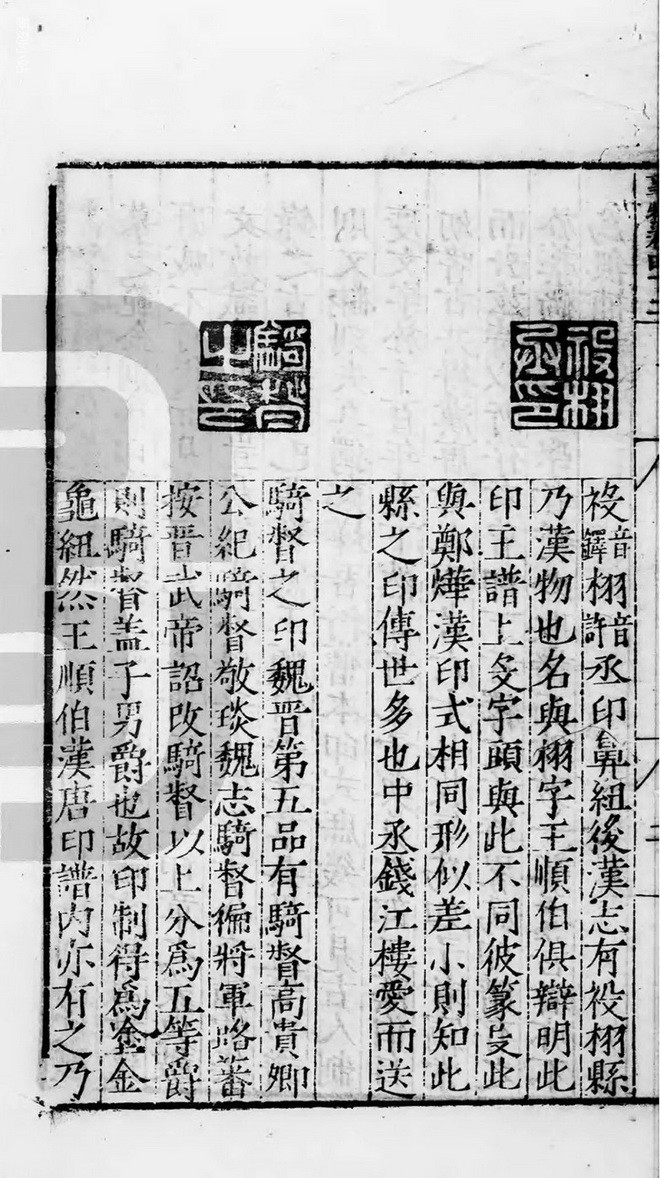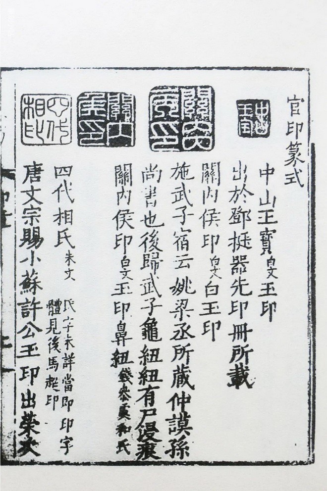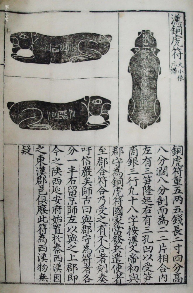(10)常图本卷末所存版刻“汉铜虎符”图案、注释文字一叶,为知见顾《谱》他本未见。《印薮》另镌雕版续用且文字大致相同,补充“汉景帝中元二年更郡守为太守”一句。