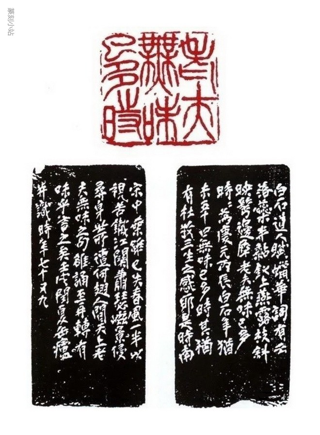 另外,边款中亦保留了一些词话性质的材料。如吴昌硕“老夫无味已多时”印,乃以姜夔词句入印,其边款云:“白石道人《腊华词》有云‘落蕊半黏钗上燕,露枝斜映鬓边犀。老夫无味已多时’。时为庆元丙辰,白石年犹未五十,曰‘无味已多时’,其犹有杜牧三生之感耶?是时南宋中叶,虽已失春风一半,以视苦铁江关萧瑟,嵫景侵寻,身世所遭,何翅人间天上。‘老夫无味’之句,雒颂至再,转有味乎言之矣!壬戌闰夏,缶庐并识,时年七十又九。”[22]吴昌硕对姜夔词句的赏析,可谓已将无限身世之感打并入词评中了,读来格外有味。
