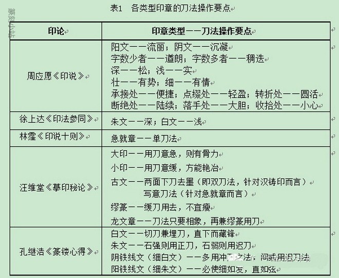 徐、吴二人是从整体上对刀法要点进行概括,而周应愿等人则是从具体的印章风格、类型,甚至印章的细节处着眼,分别概括其刀法要点。由于相关论述所言甚繁,为了直观把握主要观点,我们以列表的方式将其整理如下(表1):