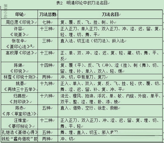 其实,从刀法的类型和运刀的过程来看,刀法最终可分为冲刀与切刀两种,且有单刀与双刀之分。从表2来看,对刀法总结最为到位的当为林霔与钱松。但林霔《印说十则》中认为“冲刀为上,切刀次之”,印学家们所总结的刀法“俱是欺人之语”,却又值得商榷。首先,冲、切刀可以创造出不同的审美效果,二者并不存在高下之分。此外,林氏批评各种纷繁的刀法皆为欺人之语,虽刺中了印学家们在阐释刀法时故弄玄虚的弊病,但是,若因此而否定明清印学家对于刀法研究所做的努力,则又属矫枉过正。客观而言,各类刀法的出现,一方面是由于印学家们为了彰显篆刻艺术的独特性而故意虚华其辞,但同时也反映了他们对于刀法的重视和积极探索。不能因为这些理论的不成熟,而否定这些研究的意义。