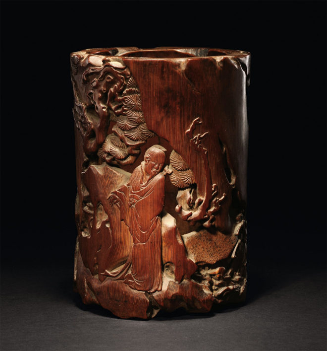 笔筒为笔墨纸砚等文房用具中最迟者,乃为雅舍、书斋案几之陈设器具,为搁置毛笔专用。竹雕器作为笔筒之大宗,以其材质虚心劲节之性颇合文人雅趣,常用以表现文人隐逸之情怀。其时,竹刻名家辈出,竹雕笔筒亦为世人推崇,可为繁盛一时。
