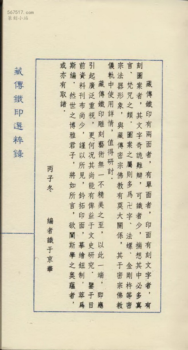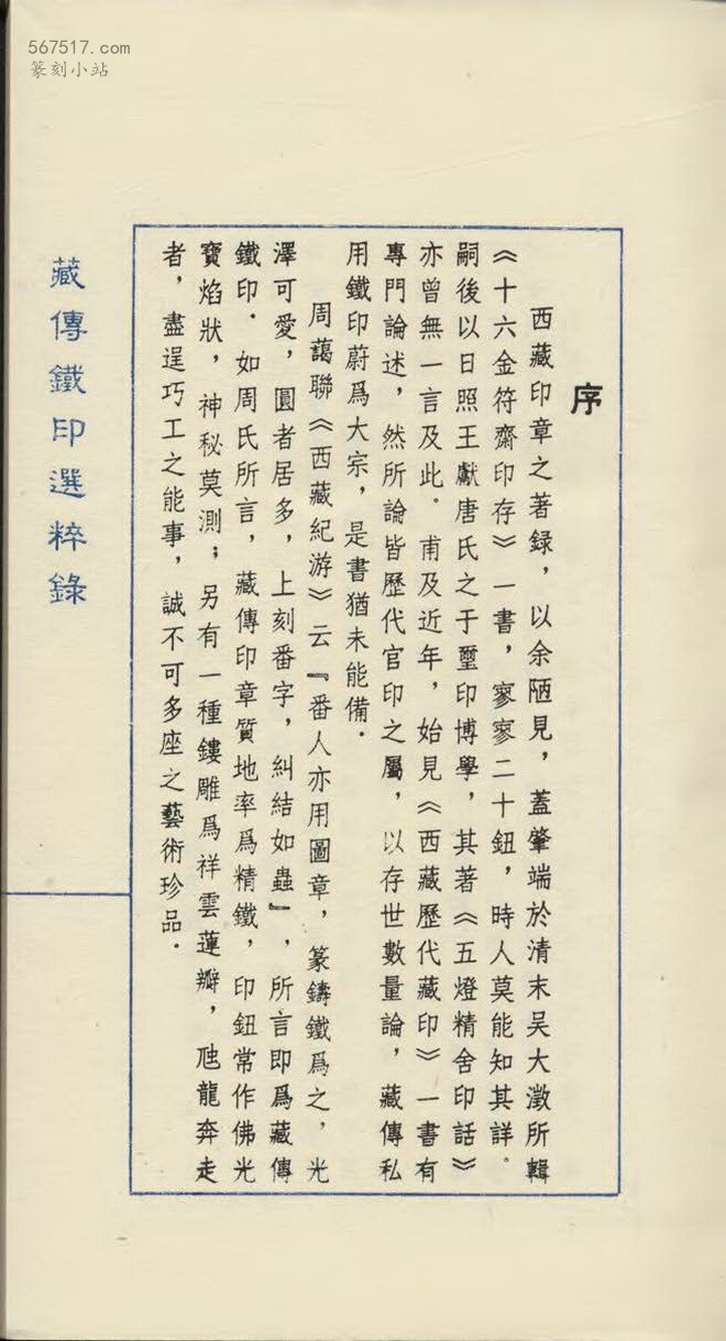 《藏传铁印选粹录》四册,不分卷。张国俊辑拓西藏地区铁印而成《藏传铁印选粹录》此谱。是谱板框幼线蓝刷,全框横七点五,竖十四点八公,每册封面周绍良署“藏传铁印选粹录,周绍良”题籤,有张国俊序一则,册四谱末有版权叶一则,书口上署“藏传铁印选粹录”隶书字样。