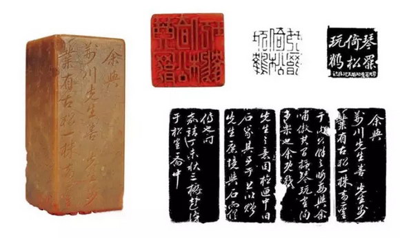 款刻于顶上的,如“雪岑先生游鄂以后所得书画记,士陵篆”、“甓禅,乙酉春仓硕“,其款上下应与印文上下相同。汉代两面印较多,前后有穿,又名穿带印,既便于携带,又便于铃用。其文可定上下,其穿可定前后,现行的两面印,印体较长,可以一面为主定方向,同一面印落款法。亦可在两面的左方各具一款,款字行列最好打横,以便于统一,并增两面美观。