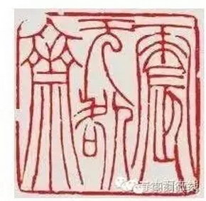 5:“震无咎斋”是一方笔意极强、形式感突出的印章,宜反复临摹。从章法安排来说,“震”、“斋”二字字形拉长,竖向笔画多,形式上对称,实质上又有区别。“无”字下方留空,与“震”、“咎”二字留空呼应。各字结体符合常见的吴氏篆书特征,上紧下松,拖笔修长,体态优美。此印有几处残破可细心体会。“斋”字左侧边栏残破可能是石质原因,临摹时可破可不破,影响不大;左上角残破不可少,因为此处形成三角块面,宜破之。另外像“无”、“震”二字上方皆有横画,边栏可残破一二。