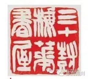 7:“三十树梅花书屋”一印,印文七字做六字空间安排,印面横向中缝留红与印面下方留红呼应。此印用刀一波三折,笔意极浓。临摹时,对刀法之迅疾处与留红巧妙处可徐图之。