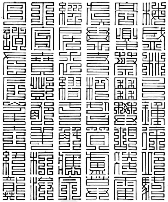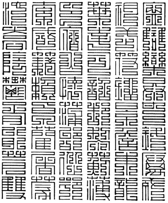 九叠篆又称上方大篆,尚方大篆。九叠篆是以小篆为基础,笔画反复折叠,盘旋屈曲,点画皆有纵横两个方向,填满空白部分,求得均匀。“曲屈平满”是九叠篆书法最大的特点。折叠多寡,每一个字的折叠多少,则视笔画繁简而定,有五叠、六叠、七叠、八叠、九叠、十叠之分。称之为九叠,“乃以九为数之终也,言其多也,”形容其折叠之多。九叠篆盛行于唐、宋、元、明,一直延续至今。唐宋以来多用于官印上面,是一种流行的“国朝官印”字体,主要用于印章镌刻,其笔画折叠堆曲,均匀对称。