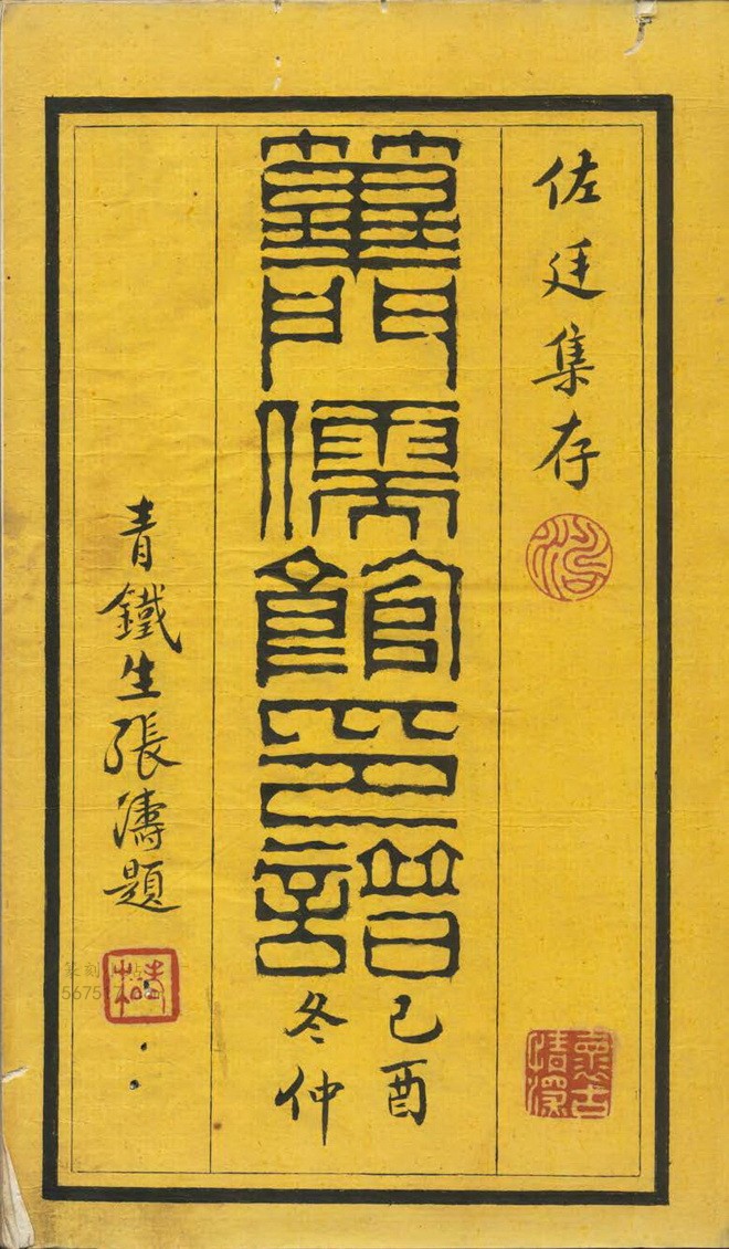 《荜门儒馆印谱》二册,不分卷。顾锦标(儒林)辑自刻印及自藏而成《荜门儒馆印谱》此谱。是谱无板框,扉叶张涛署“佐廷集存,荜门儒馆印谱,己酉仲冬,青铁生张涛题”篆书题耑,有顾锦标自序一则,顾锦标印谱具存一则,顾锦标《荜门儒馆印谱》记一则,目次一则,册一计有顾锦标自署“世存古印,佐廷顾标隶”书目次、顾锦标自署“葭汀甫刊,少蔚顾锦标篆”篆书目次、顾锦标自署“蔡少白镌,小山顾锦标篆”篆书目次、顾锦标自署“陈拙生锓,少蔚顾锦标隶”隶书目次、顾锦标自署“叶文照刻,小山顾锦标隶”隶书目次五则,册二扉叶顾锦标自署“佐廷自制,佐廷自篆”篆书目次一则,无书口字样。