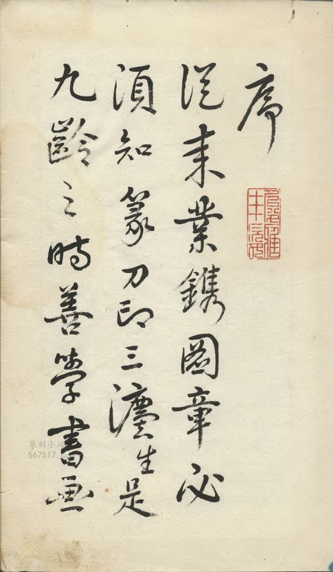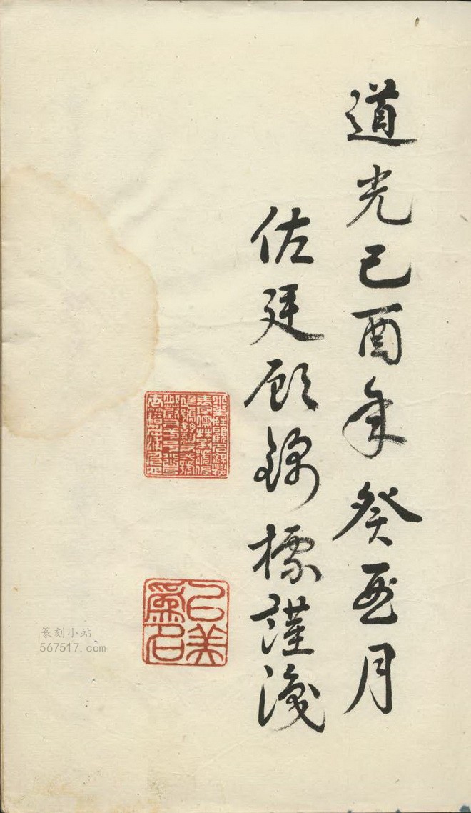 从来业鎸图章必须知篆、刀、印三灋,生九龄之时善学书画,最专刊章,细观一切古印,以及葭汀、少白、拙生、文照诸兄理法俊雅,生自又倣之,幸勿涂废,渐成一册倘大人先生、诸叔兄台阅之,祈勿见哂。生之年幼学渐未合三法之规模,拜请削正。时:道光巳酉年癸酉月,佐廷顾锦标谨识。