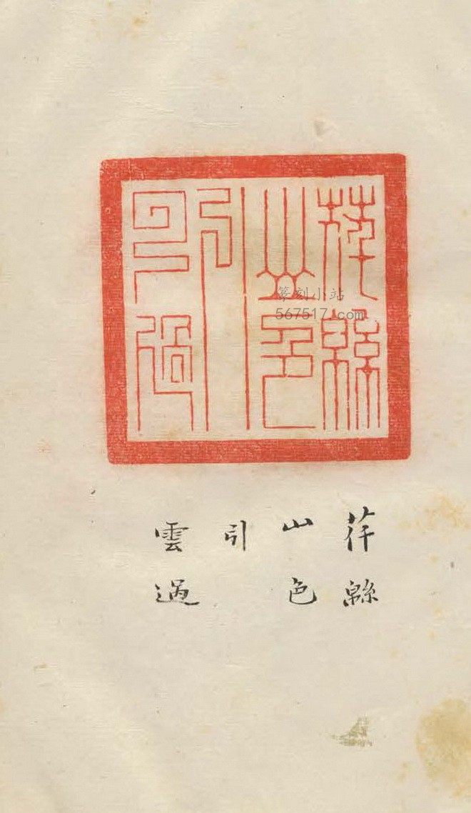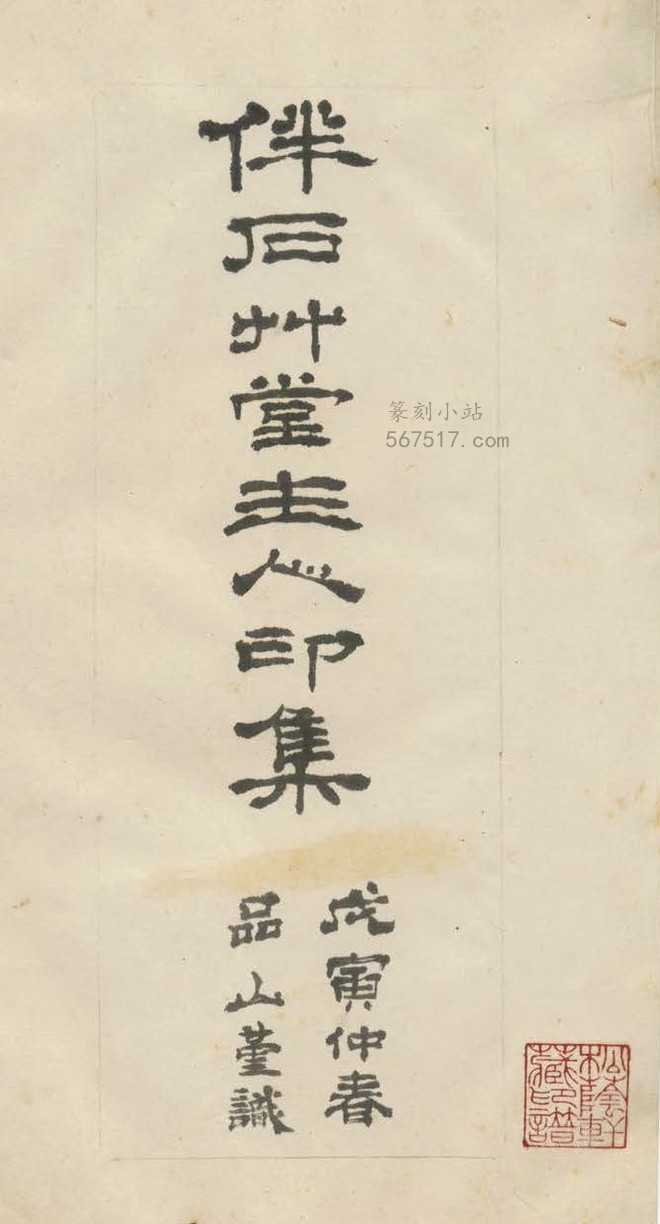 《伴石草堂主人印集》二册,不分卷。张文联辑自刻印而成《伴石草堂主人印集》此谱。是谱板框卷草纹绿刷,横十一,竖十九点八公分,每册扉叶有张文联署“伴石草堂主人印集,戊寅仲春谨识”隶书题耑,书首有张氏自序及万文田序文各一则,皆係手书墨迹,无书口字样。