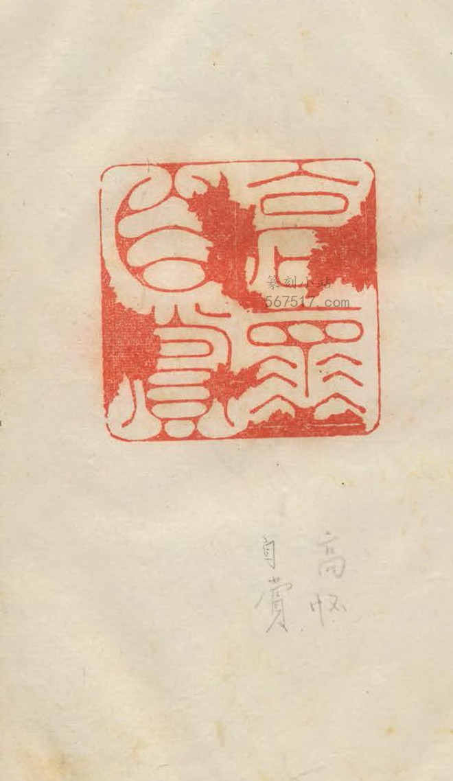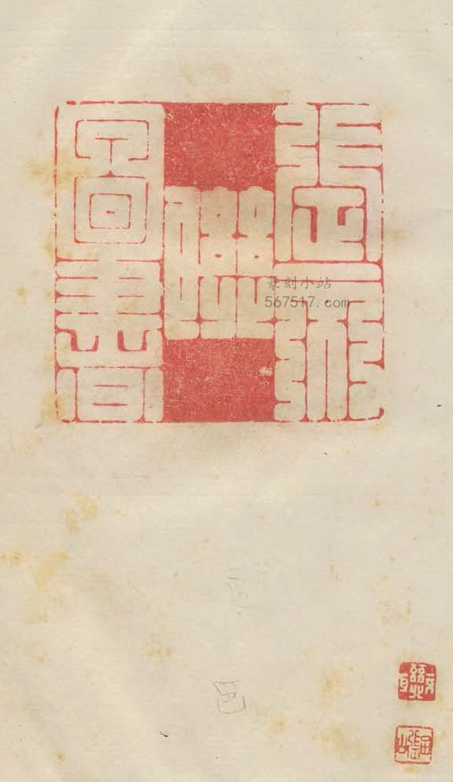 册一计百一十五叶,一叶题耑,七叶序,四叶空白,一百另三叶钤印,每叶钤印一至四方,印下无繫边款,间有附释文,录印二百三十三方;册二计一百一十四叶,一叶题耑,五叶空白,一百另八叶钤印,每叶钤印一至四方,印下无繫边款,间有附释文,录印一百四十七方,全谱总录印三百八十方。成谱于光绪四年(1878)。