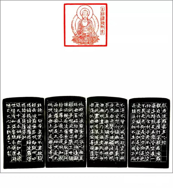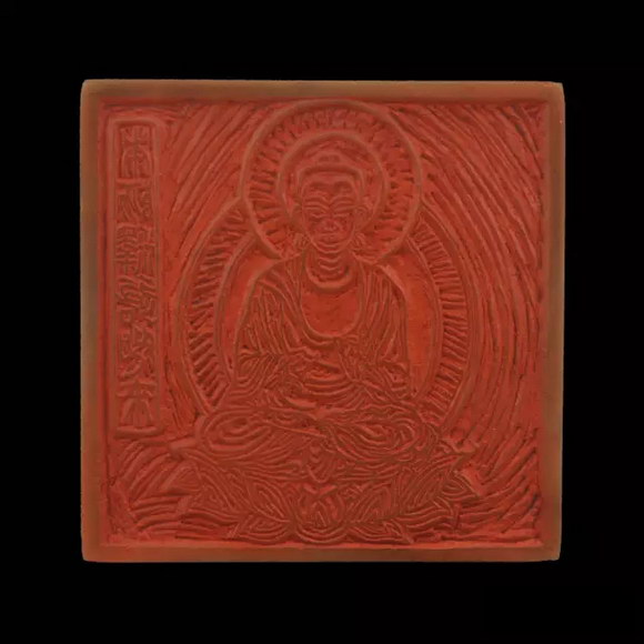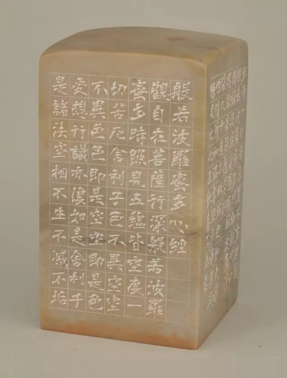 此佛像印即本于昭觉寺碑刻,由名家刻就,既有千年前敦煌石窟造像的古朴底蕴,又融入了张大千的艺术再创造。佛像以线条描绘,简练生动,面容澹然冲和,法喜充满。四面边款以魏碑镌刻《般若波罗蜜多心经》全文,笔法精到,气象堂皇,与印面相得益彰。佛像印载体为四大名石之一的昌化石,质地均匀,端庄大方。此作印、款、石俱佳,堪称收藏精品。(友情提示:此石并非张大千所刻,印面佛像源于张大千作品。)