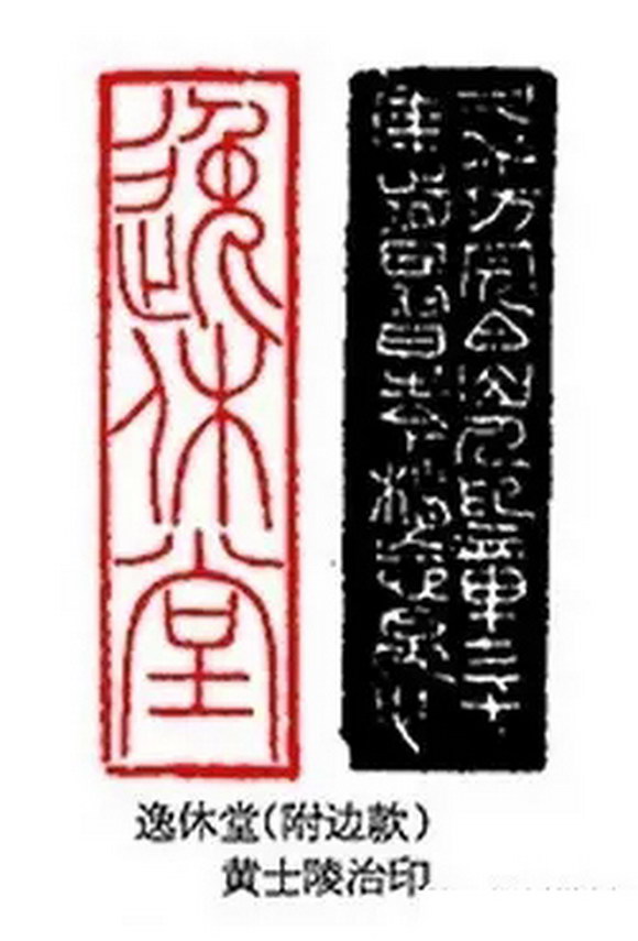 黄士陵印章边款中的书体变化较少,仅见“逸休堂”中以缪篆文字入印,笔意流畅,浑然一体。曾见一件黄士陵所刻胡开文墨锭,上有汉篆文字和《天发神谶碑》边款,于文字方面的应变能力令人赞叹。综合来看,黄士陵一生更多致力于印面文字的精选和布局,对边款稍有忽略,或者是有些作品不得见,难免以偏概全。其边款的主要成就在于刀法,迥出时流成一格。字形在隶楷之间,古朴端庄,自然大方,间或有篆隶穿插,耐人寻味。文字变化全凭刀法,慢则见篆隶遗韵,萧散淳朴,快则有行草笔意,暴风骤雨,间不容针,不管如何都是金石味十足。