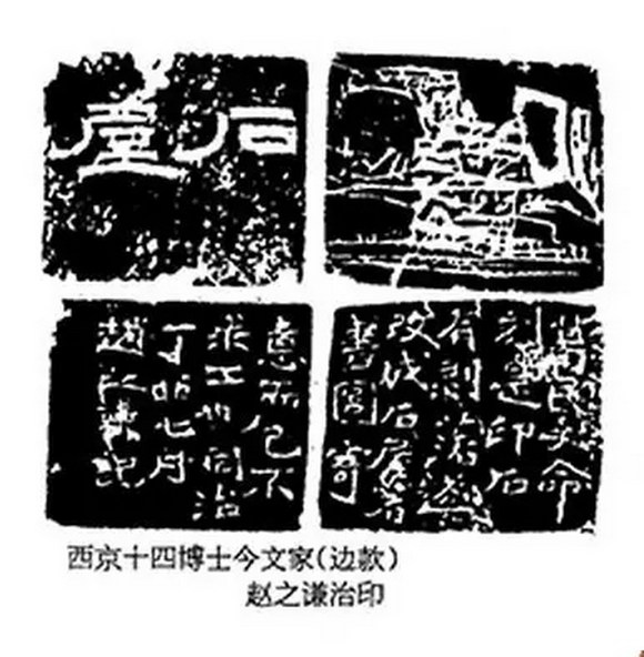 赵之谦在边款方面有许多开创之举。除了前文提及的朱文魏书刻边款之外,还有汉画像、佛像等多元体裁的引入。篆隶魏楷无体不备,同时边款更是畅谈个人印学思想观点的小天地,最有名的莫过于“巨鹿魏氏”边款中的“古印有笔犹有墨,今人但有刀石石。此意非我无能传,此理舍君谁可言”,不但说到了刀石和笔墨的关系,更强调了于印学一道知音难求的肺腑之言。赵之谦于边款的经营已达到一种极致。“西京十四博士今文家”款宛如摩崖的微缩版。其阴刻魏书边款,不做修饰,从无雕琢之意,一任自然,完全就是北魏墓志的缩小版,功力之深令人咋舌,不得不对他在艺术方面先知先觉的敏锐度表示叹服。在赵之谦的手中,钢刀化为柔毫,坚石变成纸帛,可以任意挥洒,后世无人能够相颉顽。赵之谦留存于世的印章不过二三百,经典边款十余方,便足以雄视千古。