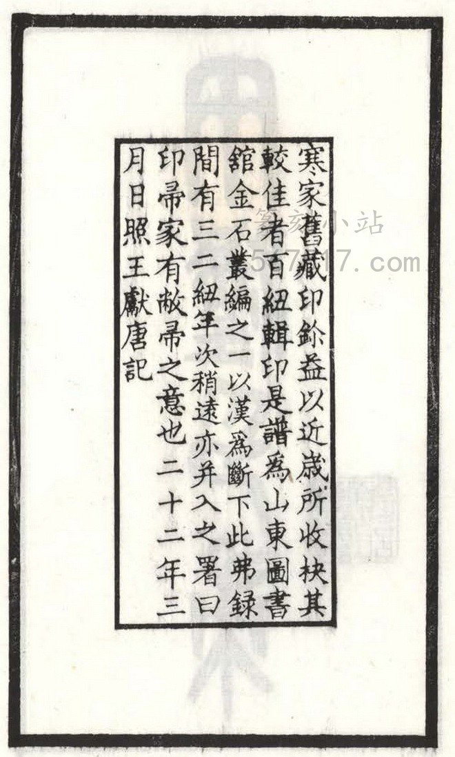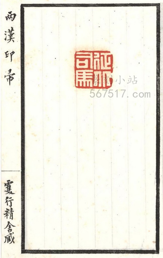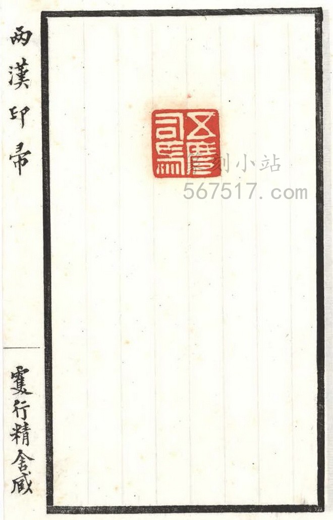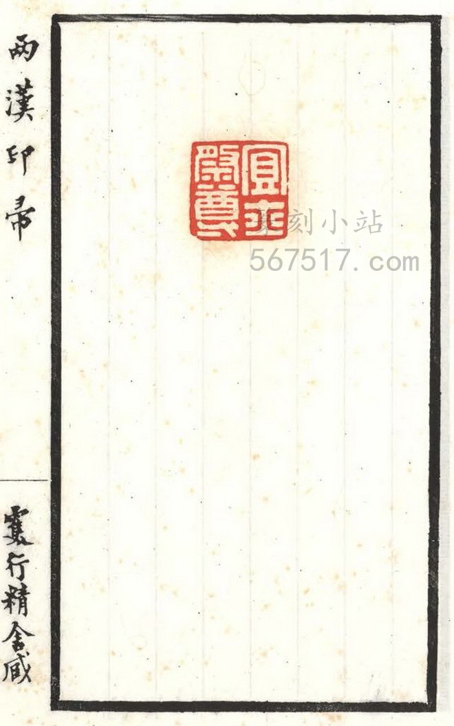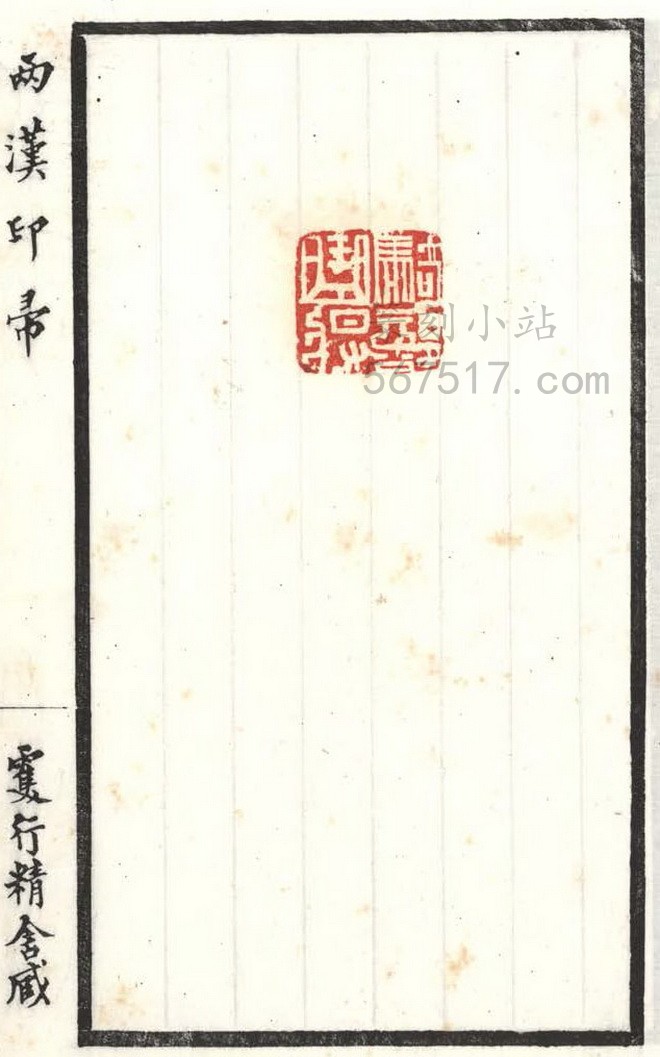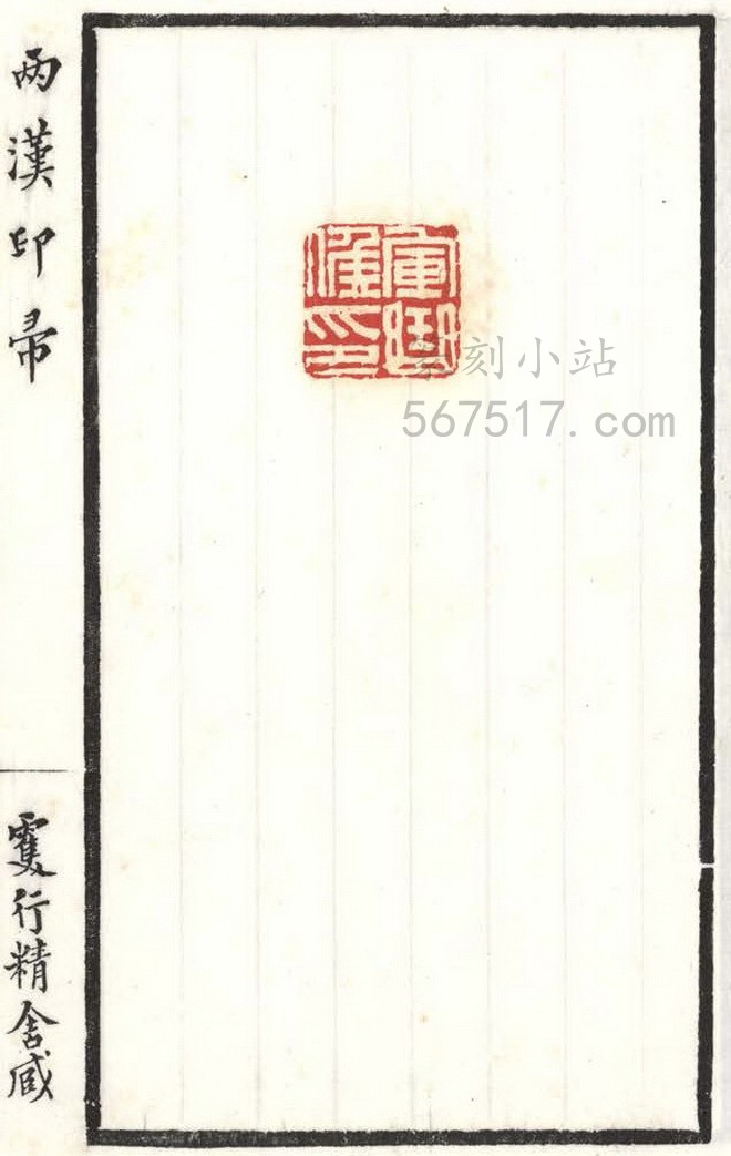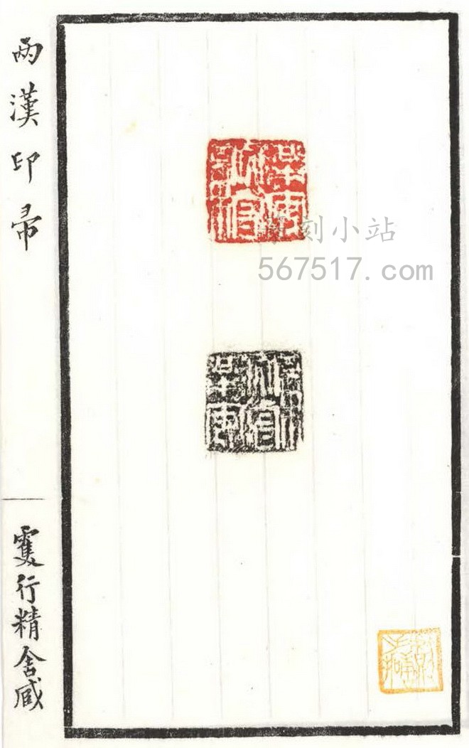 《两汉印帚》叁册。王献唐(凤笙)编辑自藏古印而成《两汉印帚》此谱。是谱板框粗线墨刷, 横九点叁,竖十六点九公分,扉叶有王献唐篆书署「两汉印帚」题耑,里叶钤有王氏家藏齐鲁古印」印一方,书口上署「两汉印帚」行书字样,下端署「双行精舍藏」行书字样。