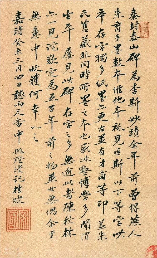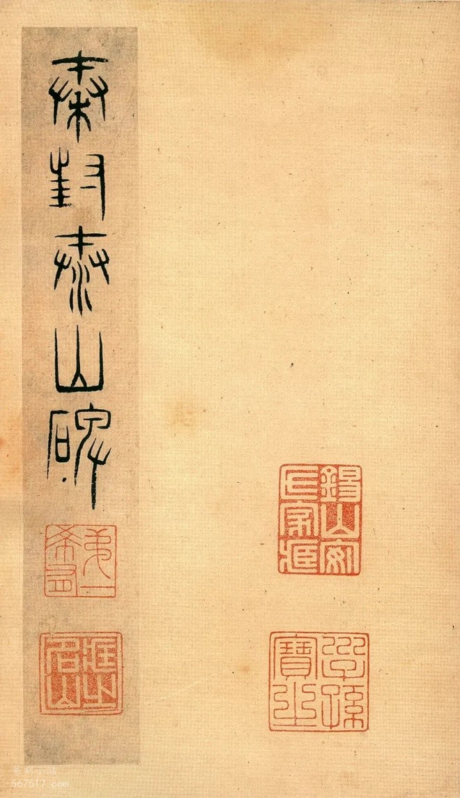 《泰山刻石》又名《封泰山碑》,立于始皇二十八年(公元前219年),是泰山最早的刻石。前半部系公元前219年秦始皇东巡泰山时所刻;后半部为秦二世胡亥即位第一年(公元前209年)刻制。刻石四面广狭不等。两刻辞均为李斯所书。书法严谨浑厚,平稳端宁;字形公正匀称,修长宛转;线条圆健似铁,愈圆愈方;结构左右对称,横平竖直,外拙内巧,疏密适宜。具有极高的艺术价值。