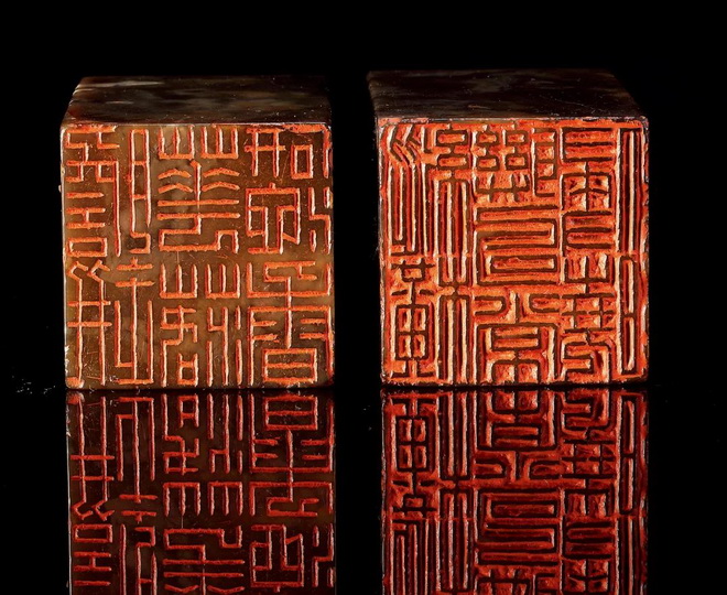 自元人王冕首创以花乳石人印,由此开创了篆刻的新纪元,自明至清将篆刻推向一个崭新的高潮。在这期间流派纷呈、争奇斗艳,以王睿章父子、鞠履厚、仇垲等为首的云间派,亦占得一席之地。本件拍品,即为云间派的重要代表人物仇垲所作。皇清书史卷二十一有载:仇垲字遐昌号霞村,为康熙二十四年进士、官吏部侍郎仇兆鳌曾孙。翁方纲〈赠仇霞村(垲)〉诗云:甬东学士之孙子,摹印研朱日千纸。依然学士笺诗法,丹汞金膏瓶泻水。云湿不渗燥不枯,我家铁网真珊瑚。但愧我书乏笔力,敢言聚墨如黍珠?语我珠光养诸内,自古良工璞先晦。寸铁何补伯盛名,饮酒且赠王含行。能得饱学之士翁方纲如此赞誉,仇霞村的功力足可见一斑。此对印章的印文及边款所显现的,就是最好的佐证。其篆法以汉为宗,刀法工致却不失金石之气,深得秦汉韵味之真谛。所署双刀楷书边款尤值称道,字体流畅自如,十足的晋唐气韵、格调不俗,使刀如笔、功力非凡。纵览历代印谱及所有拍卖资料,可以发现仇垲的印作记载十分罕见。这是仇垲目前唯一流通于世的孤品原作,并且有着非常明确的传承,乃吴中玺印篆刻与历代印谱收藏大家,槐荫庐主人王哲言先生的旧藏。历经《明清篆刻流派印谱》、 《中国玺印篆刻全集》、《中国历代印风系列-清初印风》重要印谱明确著录,尘封数百载后,于2016年在中国嘉德王哲言旧藏专辑中释出。一件集传世孤品、重要著录、名人旧藏于一身的无上妙品,其重要性不言而喻。