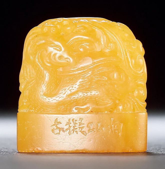 清胡菊邻田黄兽钮章,此章选料上称,质地细密坚实,色泽金黄滋润,属质色俱佳之选。印章随形施艺,顶端以浅刻之法雕琢兽钮,虽造型小巧,但雕工一丝不苟,以细密的皴点装饰,线条起伏流畅,且经多年盘玩,包浆圆融。底部篆书印文“三径花香”。