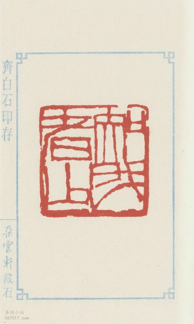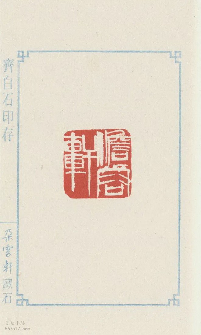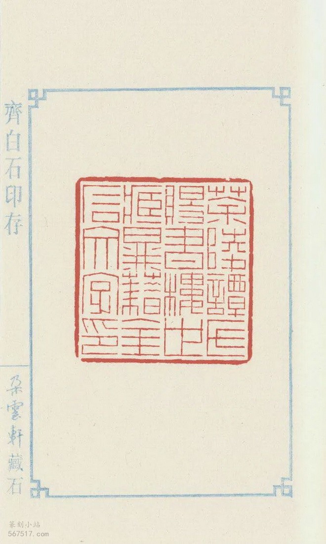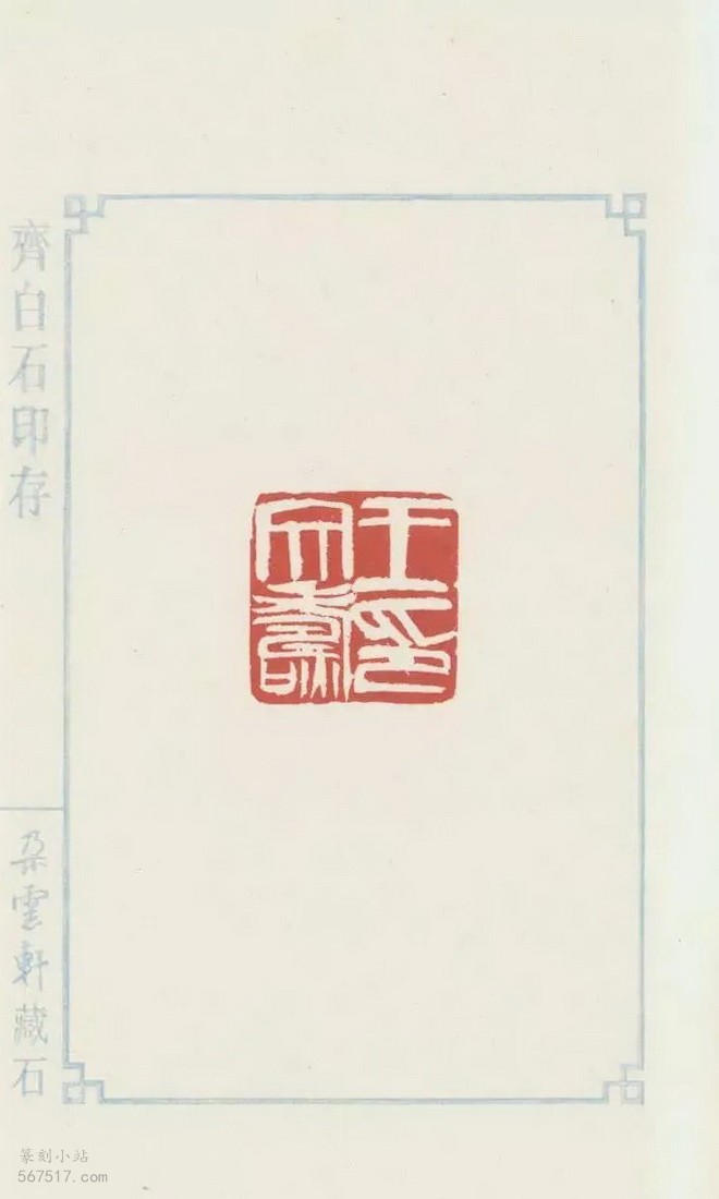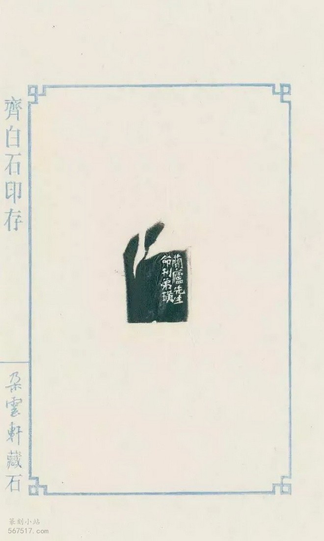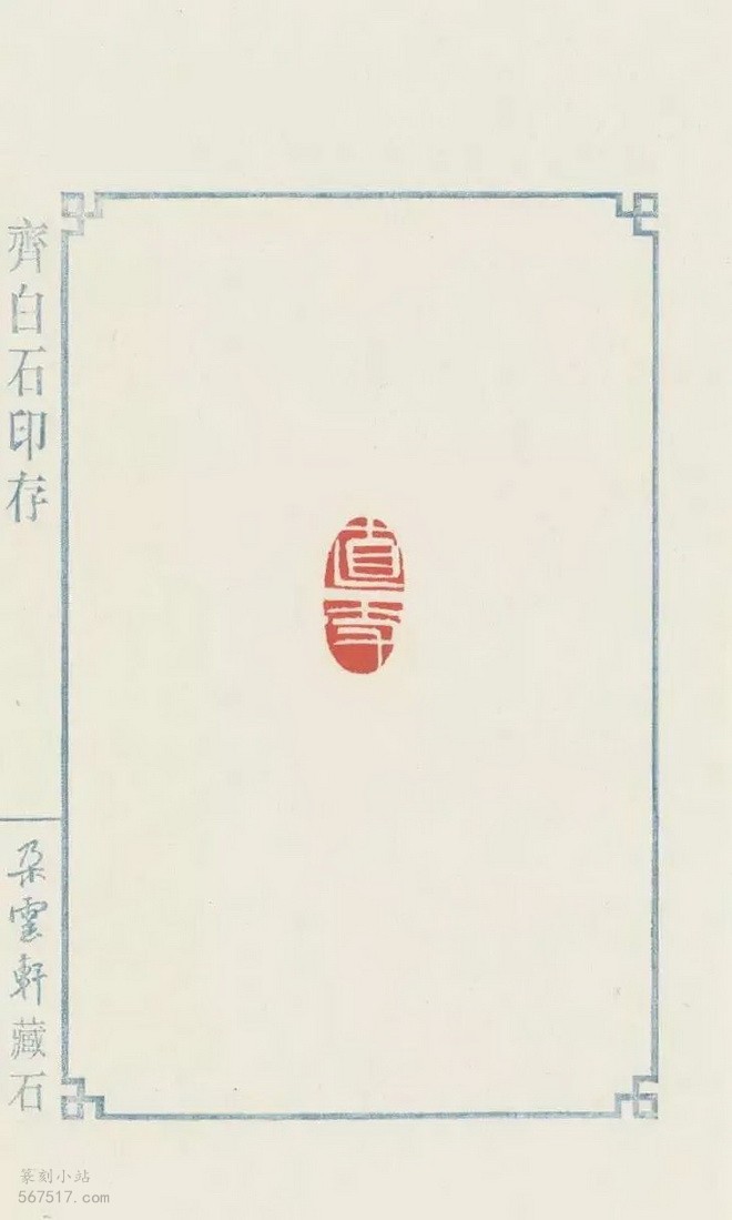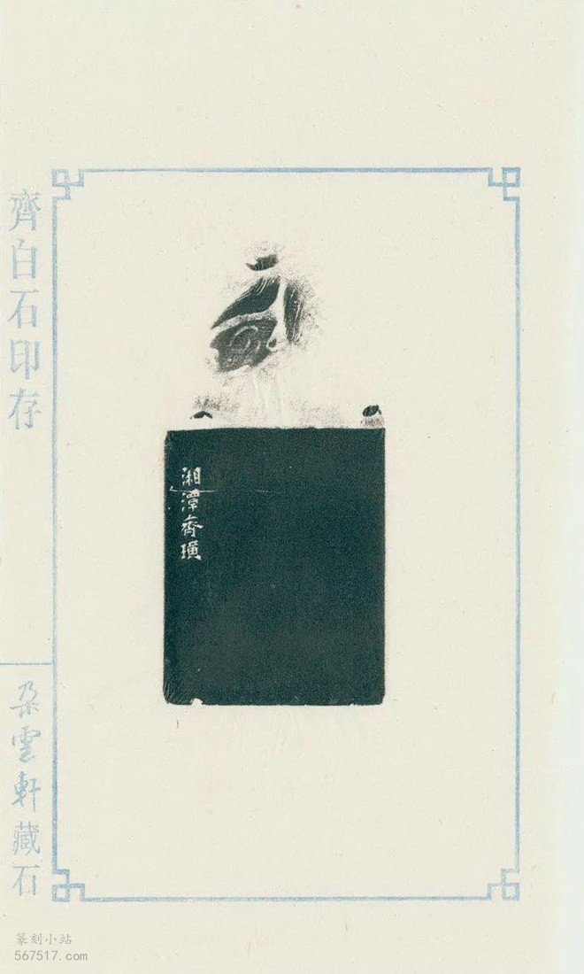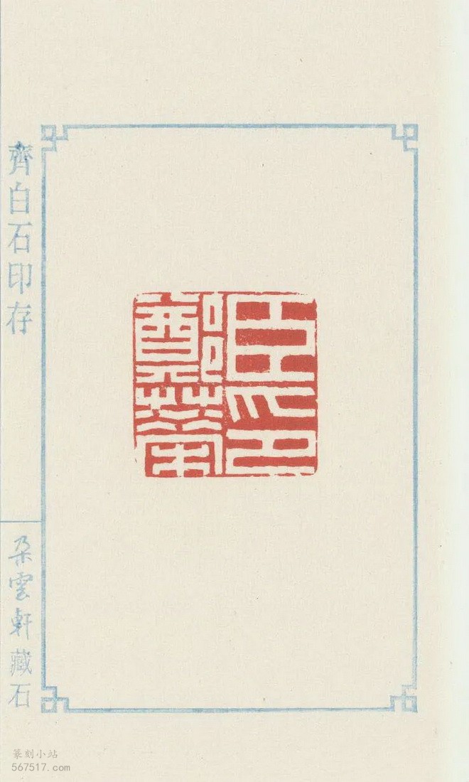 齐白石一生刻印逾万,为朱屺瞻一人就治印七十余方,二人因印而结缘。朵云轩以历年集藏齐白石印石手工钤拓印谱,朱屺瞻欣然为该谱作序:齐璜先生,字渭清,号白石。一生对书法、诗词、绘画、篆刻刻苦钻研,数十年如一日,锲而不舍,上追古人并吸收当代各家所长,大胆独造,终成为我国近代之巨匠。他的篆刻艺术,在其艺术遗产中是一份宝贵的珍品。
