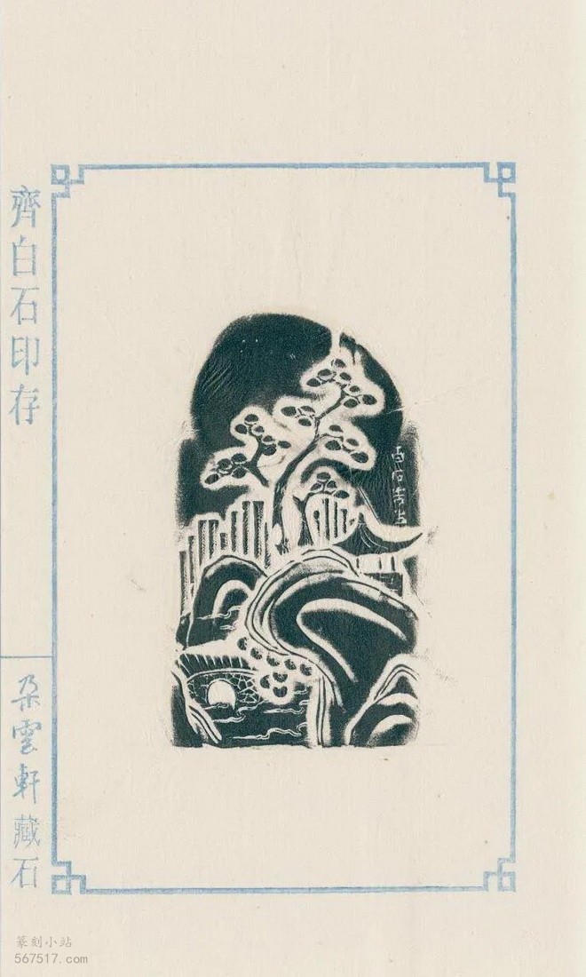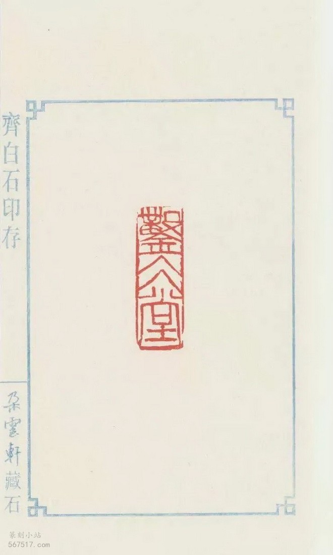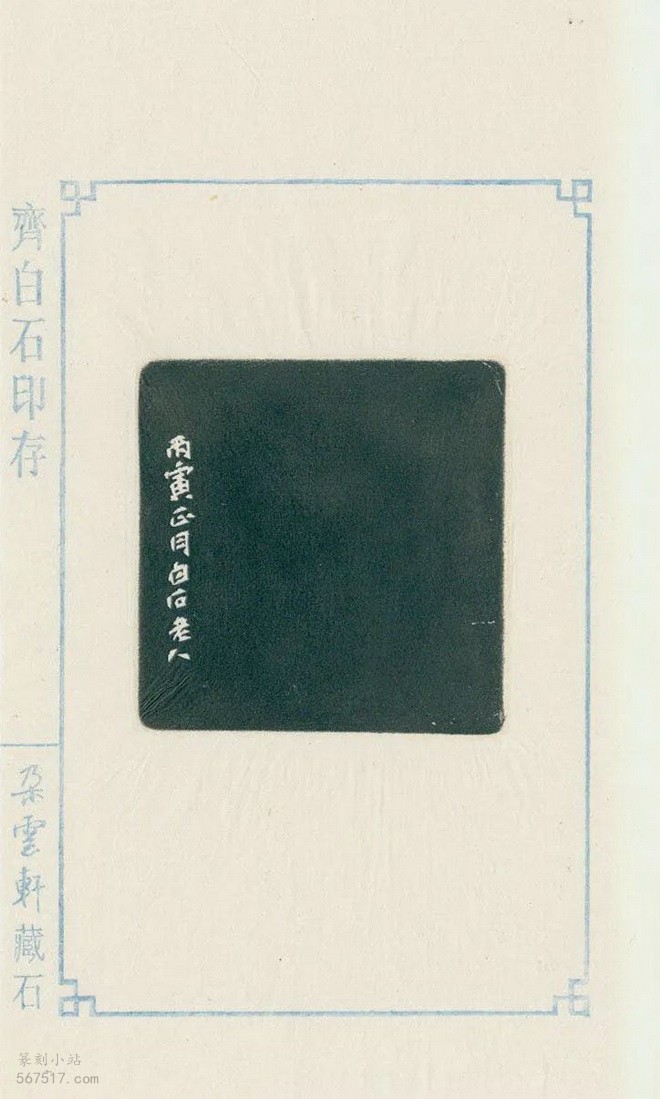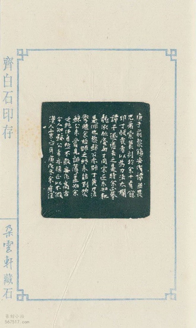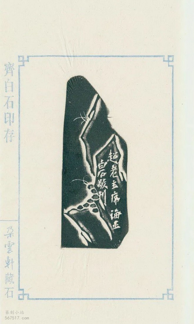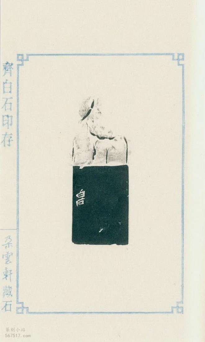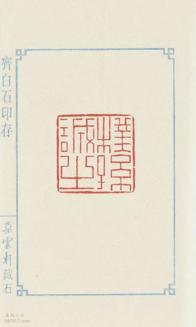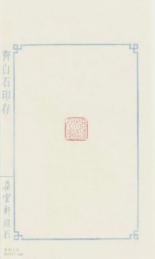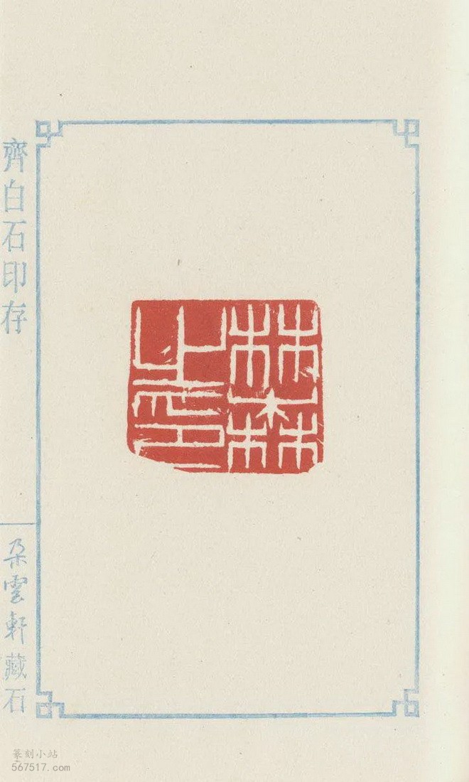 齐白石一生刻印逾万,为朱屺瞻一人就治印七十余方,二人因印而结缘。朵云轩以历年集藏齐白石印石手工钤拓印谱,朱屺瞻欣然为该谱作序:齐璜先生,字渭清,号白石。一生对书法、诗词、绘画、篆刻刻苦钻研,数十年如一日,锲而不舍,上追古人并吸收当代各家所长,大胆独造,终成为我国近代之巨匠。他的篆刻艺术,在其艺术遗产中是一份宝贵的珍品。
