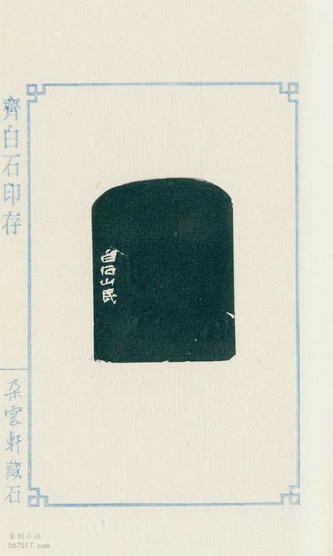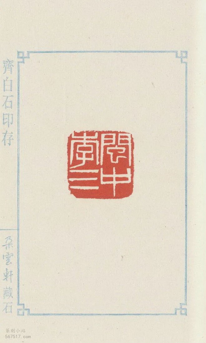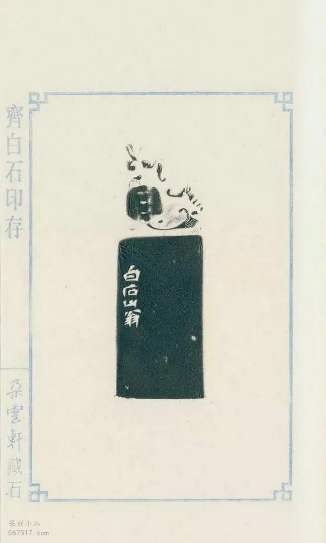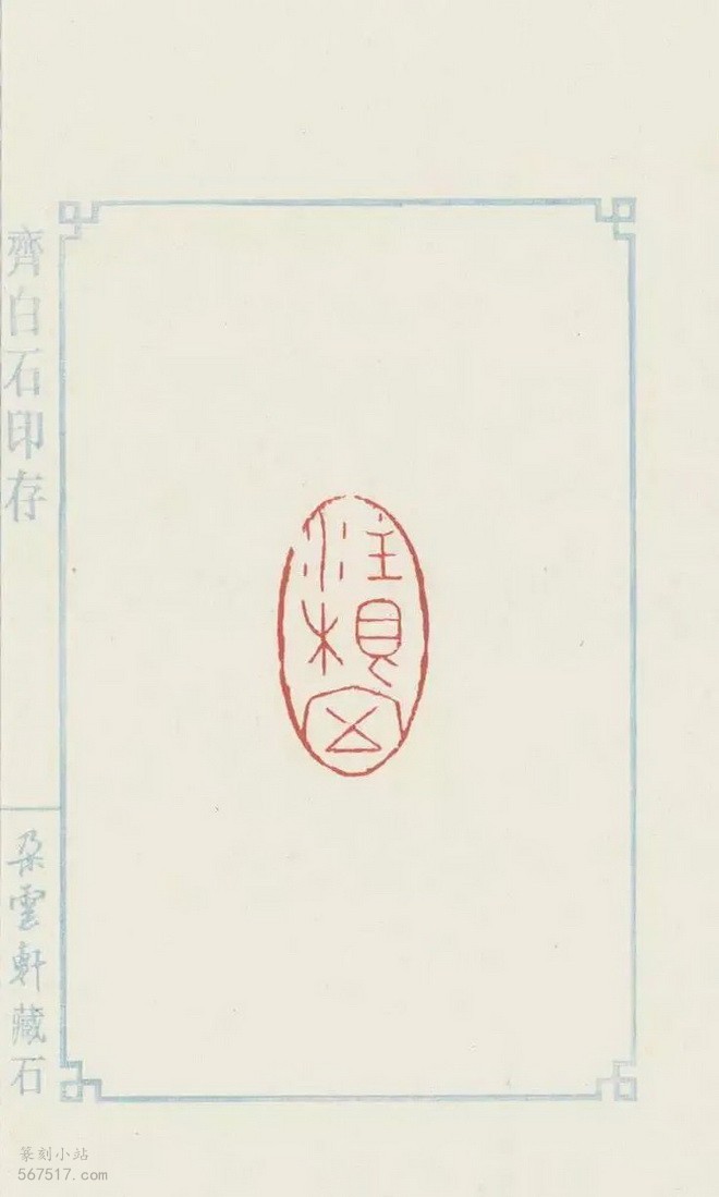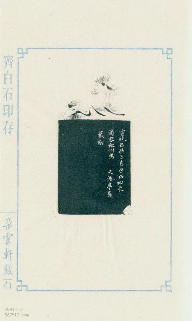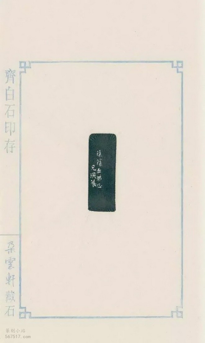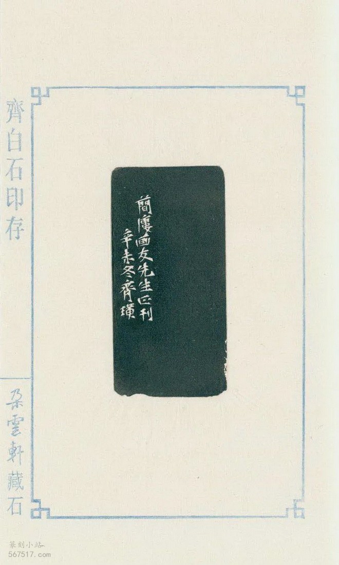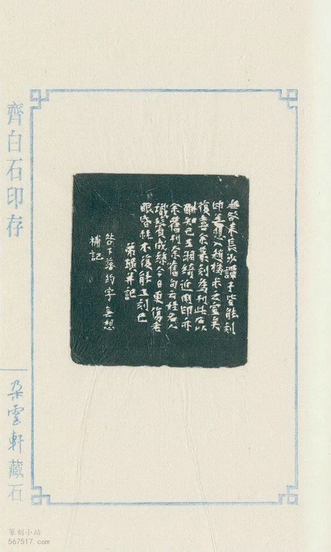 齐白石一生刻印逾万,为朱屺瞻一人就治印七十余方,二人因印而结缘。朵云轩以历年集藏齐白石印石手工钤拓印谱,朱屺瞻欣然为该谱作序:齐璜先生,字渭清,号白石。一生对书法、诗词、绘画、篆刻刻苦钻研,数十年如一日,锲而不舍,上追古人并吸收当代各家所长,大胆独造,终成为我国近代之巨匠。他的篆刻艺术,在其艺术遗产中是一份宝贵的珍品。
