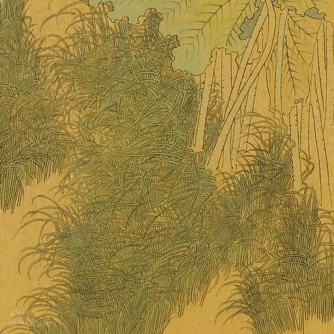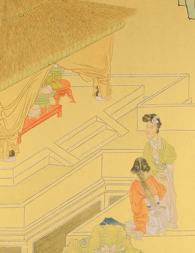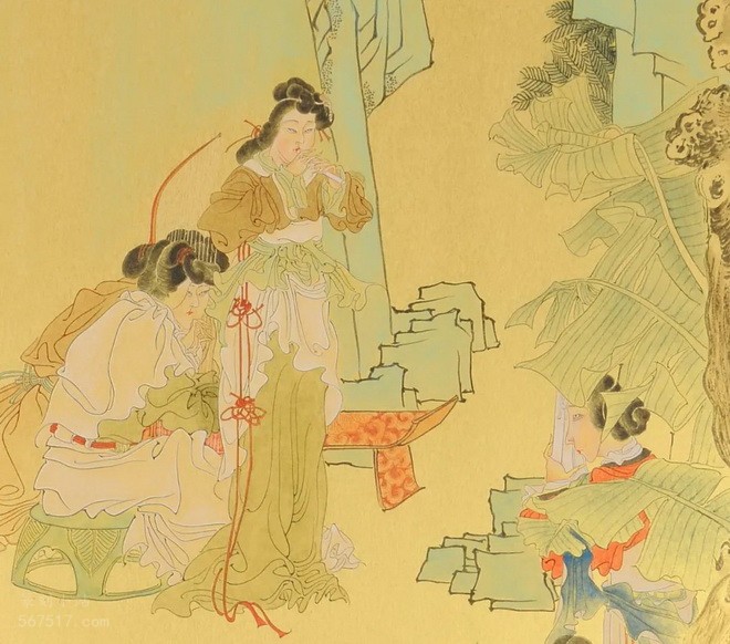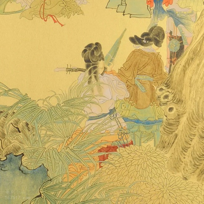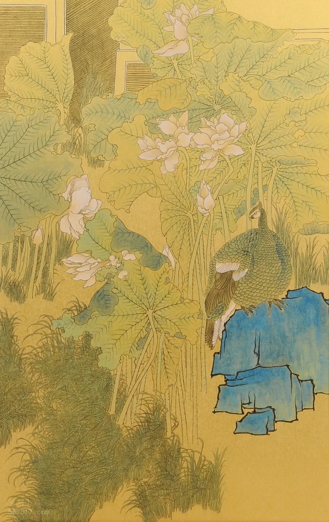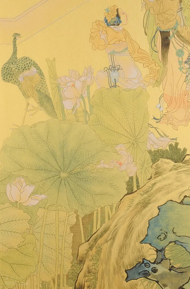 “群仙祝寿图”,尽管是在描写民间传说中的神仙故事,但一举一动都反映出人的性格和情感。把行动诡异的仙人和举止窈窕的仙女种种神态,对照起来看,分外有趣。仙女和仙人,有从空中来,有从海上来,来的地方不同,画面似将各地不同的习惯和性情都表达出来了。一只白鹤,忙着跨上白玉阑干,展翅起舞,回头迎生,竟似一个仙女在拍手热烈欢迎仙宾的情感一样。一对孔雀,也有不同性情:一只爱凑热闹,凝神看着一个举袖轻舞的仙女,另一只似乎嫌太烦乱了,飞到荷香深处,安踞石上,静听着仙女们演奏的美妙音乐,景态十分生动。十二幅通景屏,幅幅风光旖旎,融洽愉快,充分表达了祝寿场面的气氛。