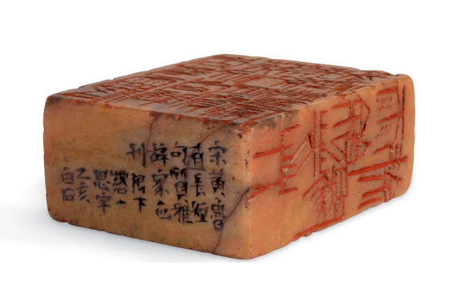 齐白石刻青田石四面印,印文乃黄山谷画堂春词(一说为秦少笴作),名篇佳刻,珠联璧合,“如此至宝存岂多”!印文:1、东风吹柳日初长 2、雨余芳草斜阳 3、杏花零落燕泥香,睡损红妆,宝象烟消鸾风 4、画屏云锁潇湘,夜寒微透薄罗裳,无限量。(白)
